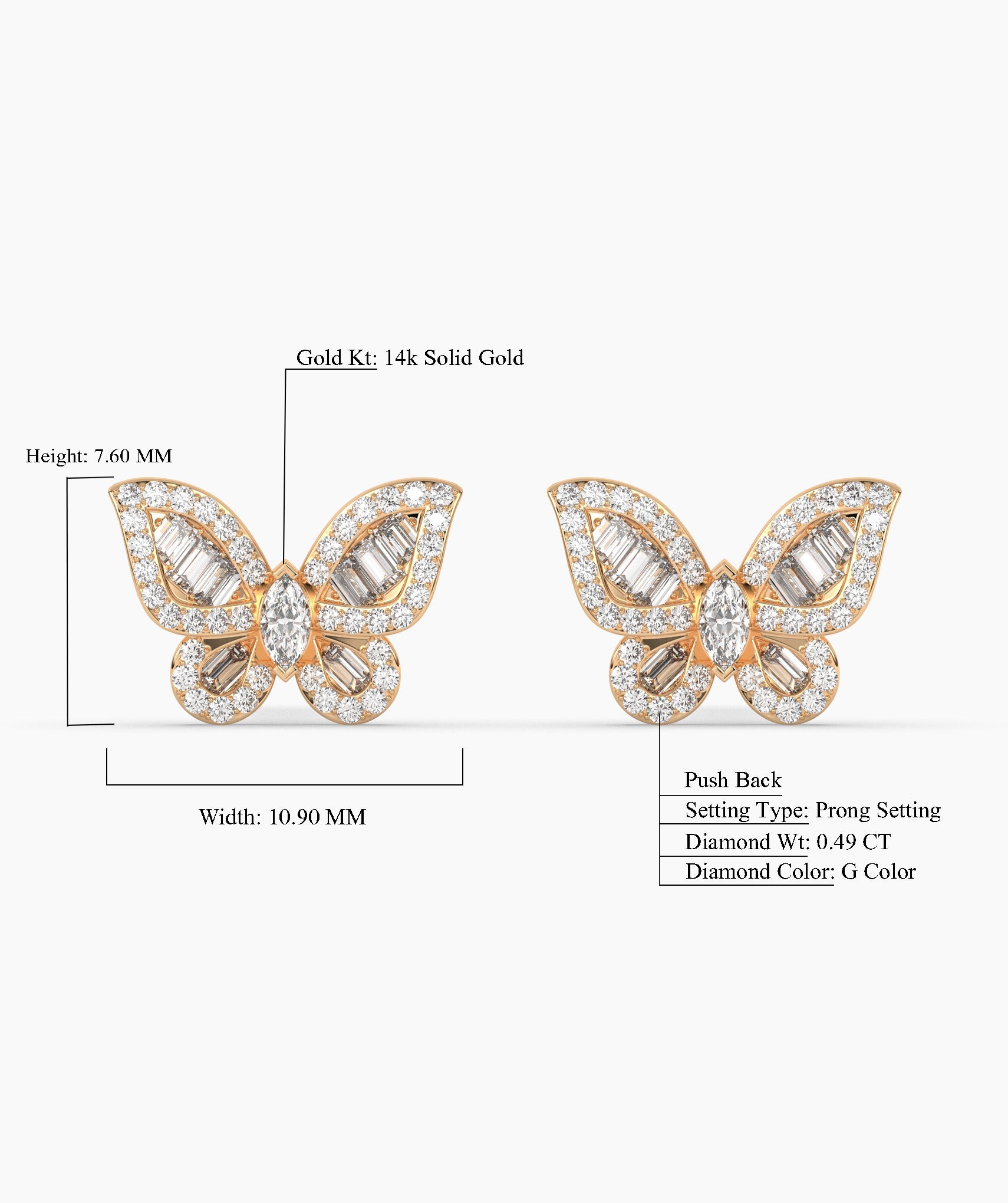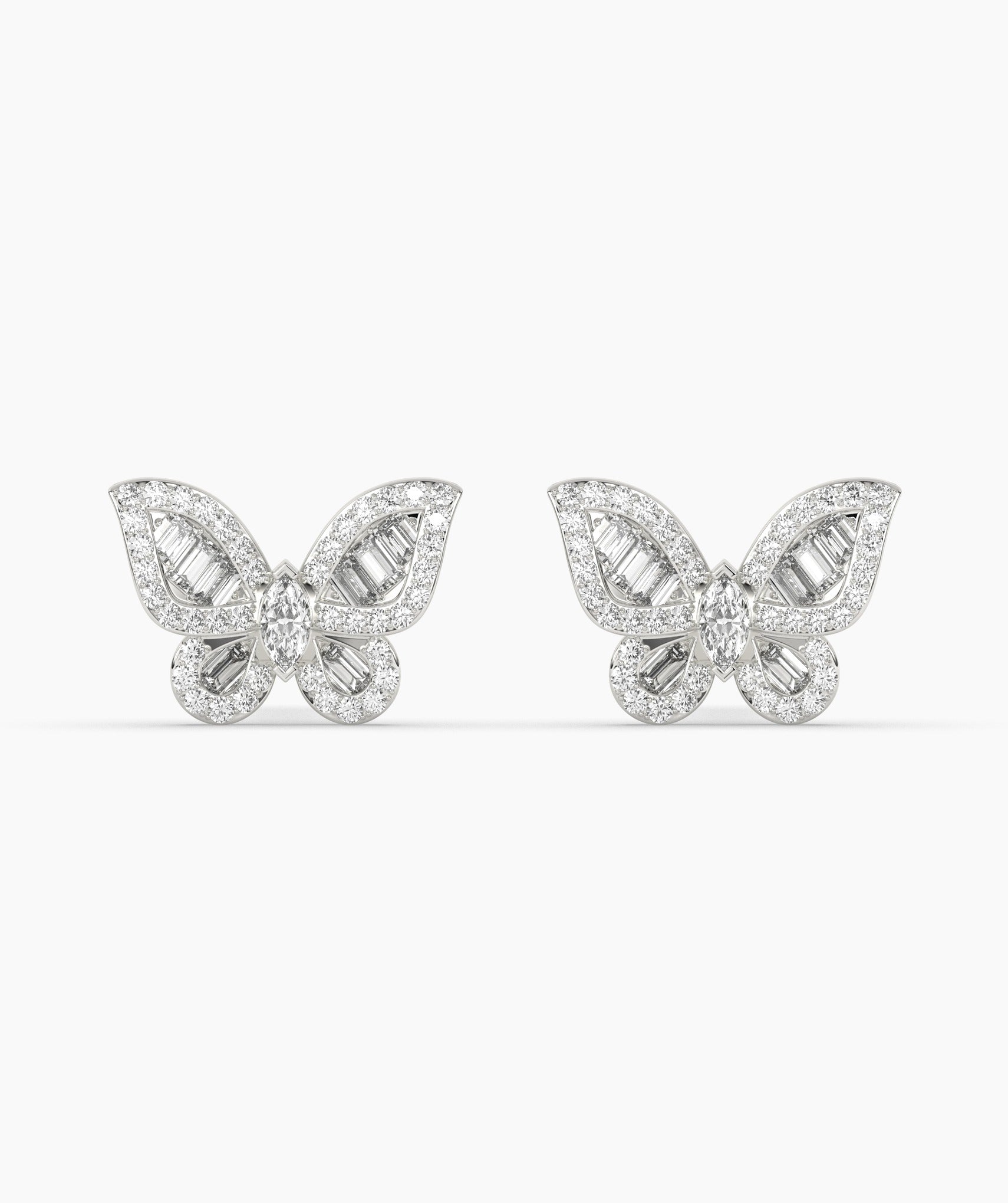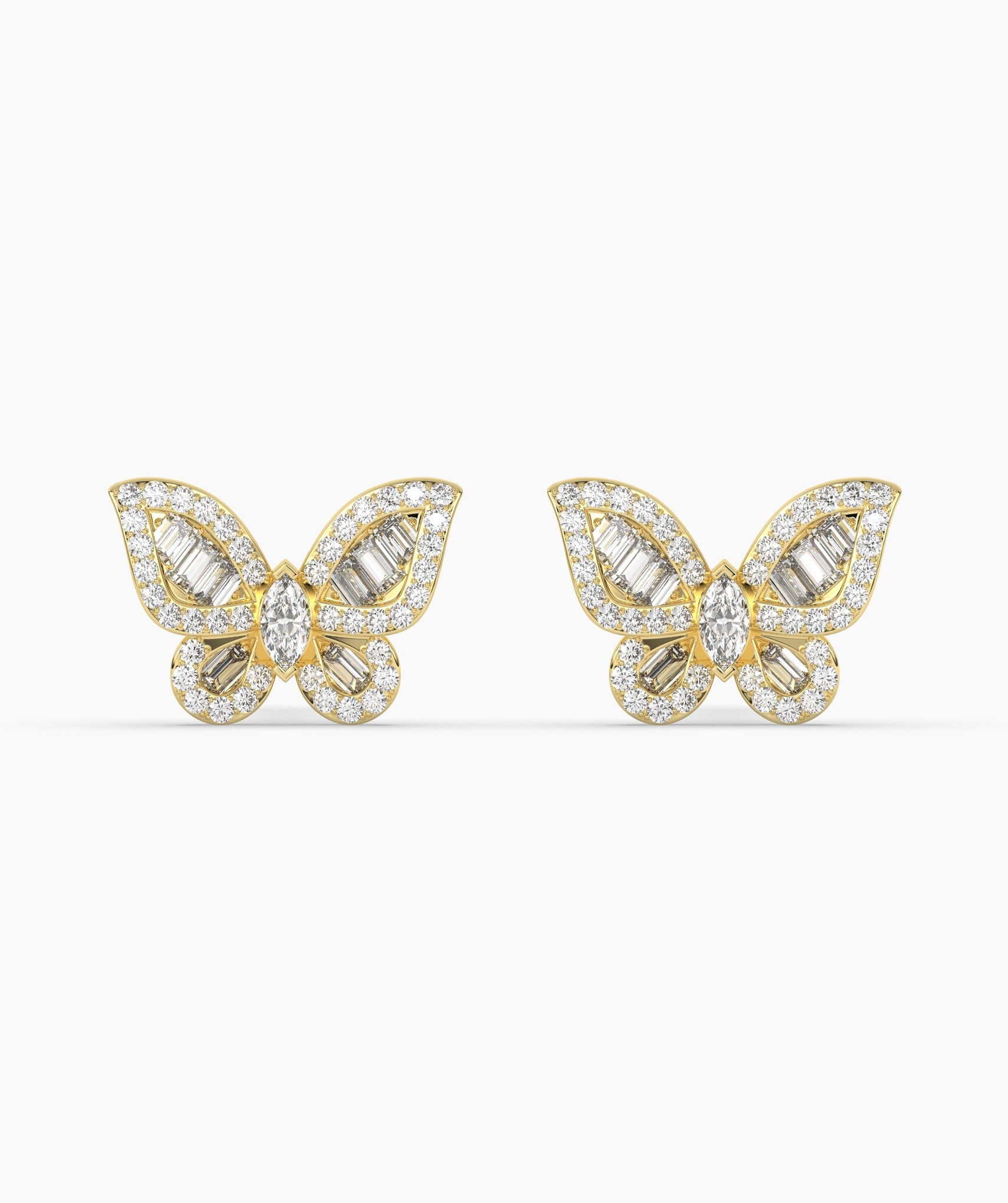 These enchanting 14K solid gold butterfly earrings are adorned with a mix of marquise and round diamonds, creating a dazzling effect reminiscent of sunlight.