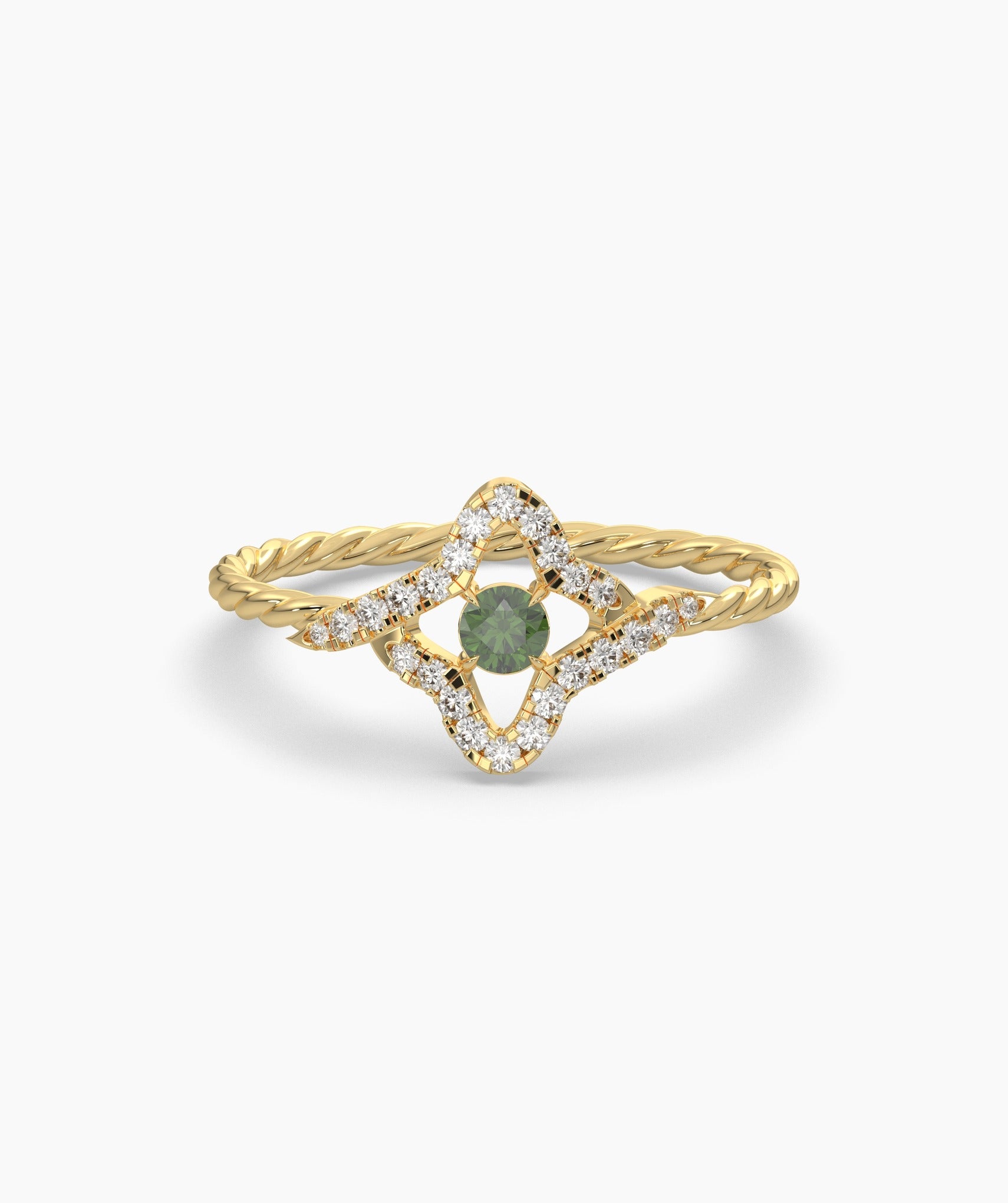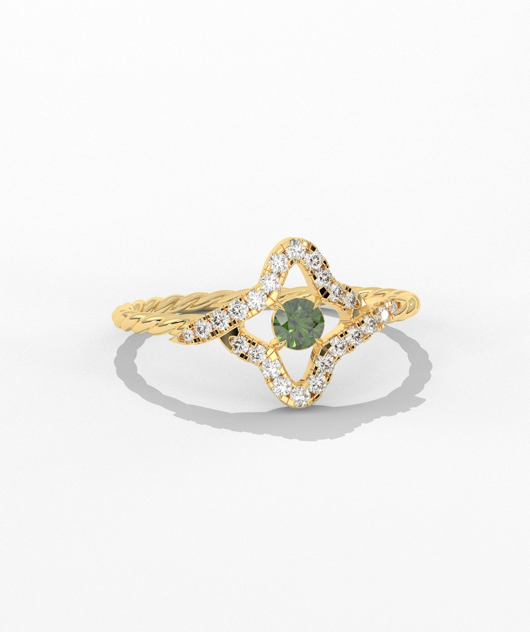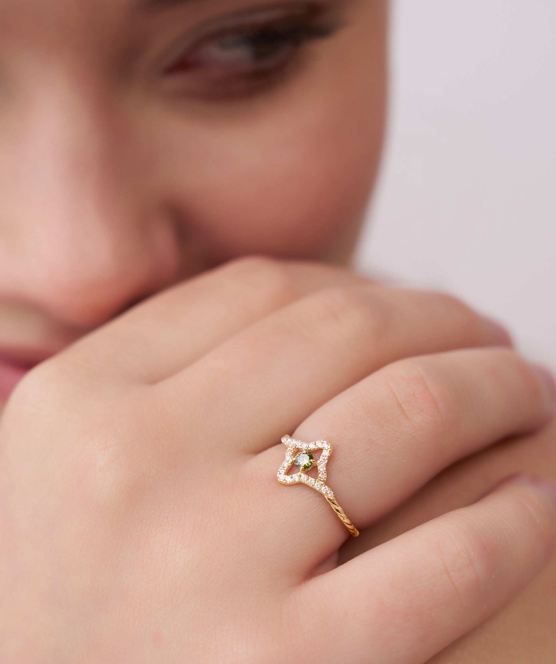 Elegant and eye-catching, this ring showcases a yellow center stone embraced by a halo of sparkle, set on a sleek 14K gold band.