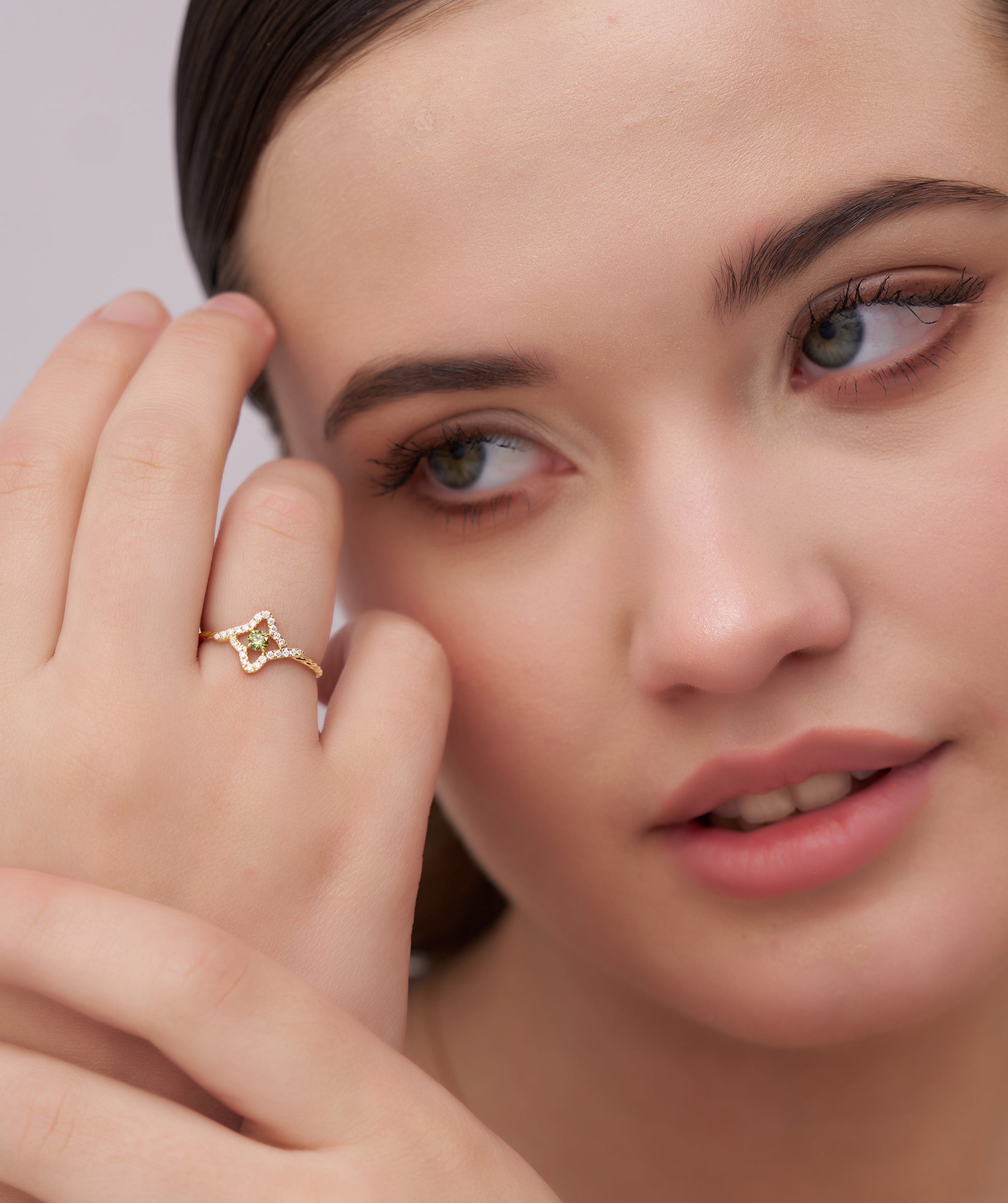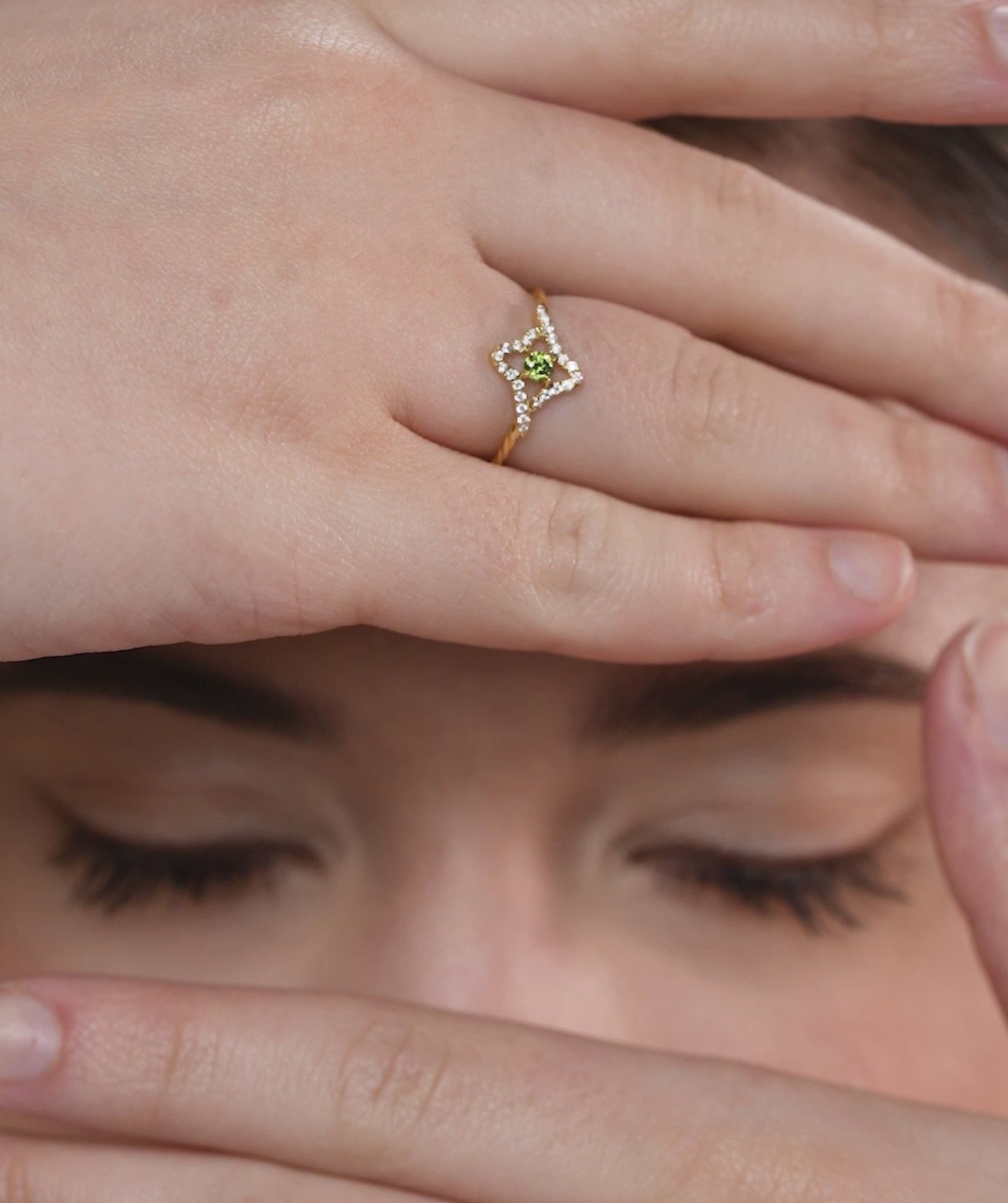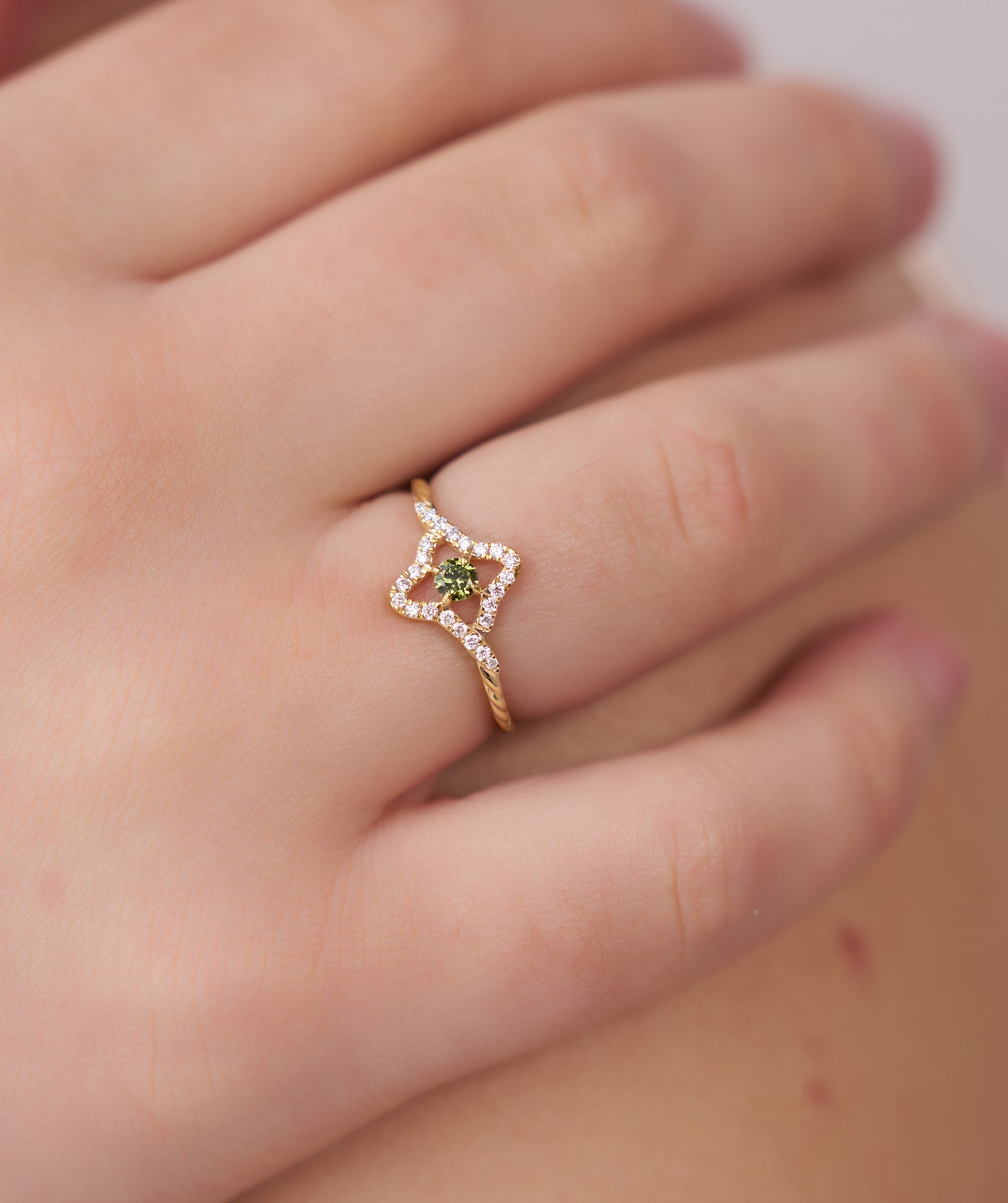 Elegant and eye-catching, this ring showcases a yellow center stone embraced by a halo of sparkle, set on a sleek 14K gold band.