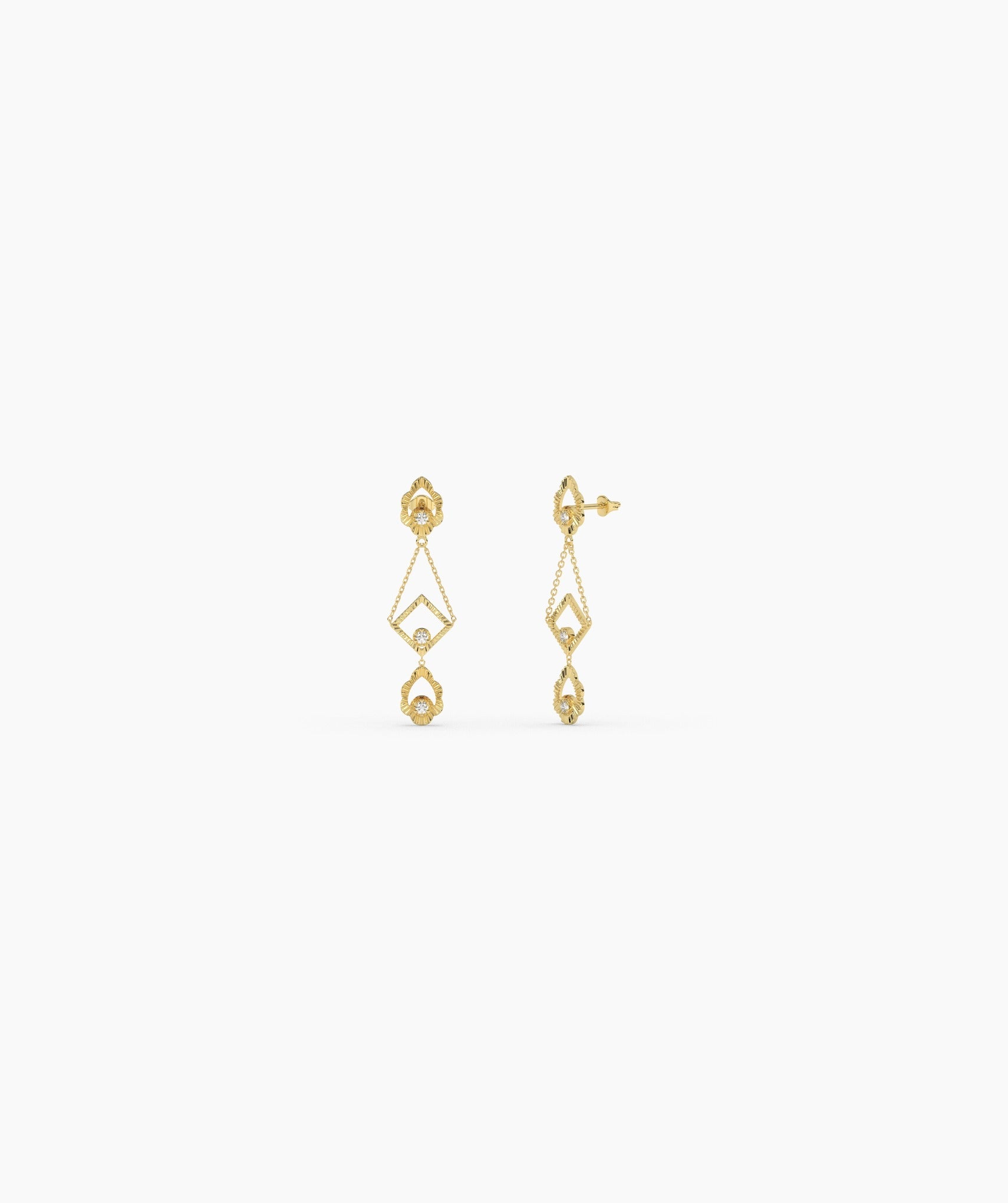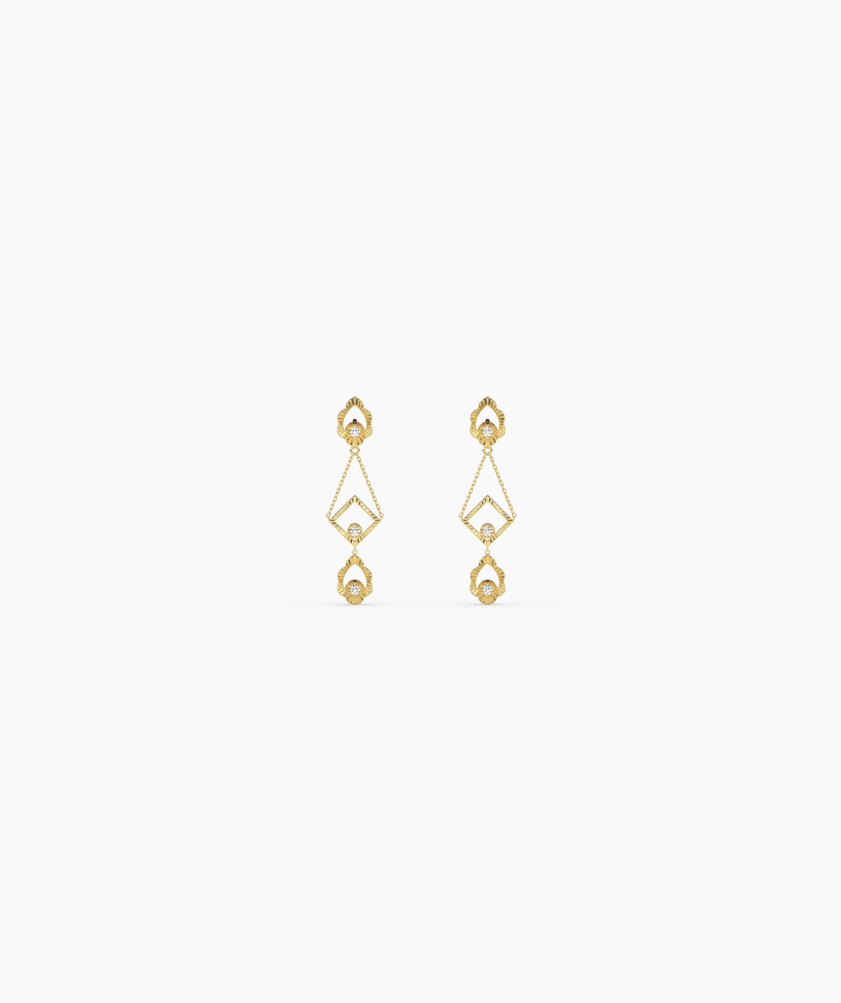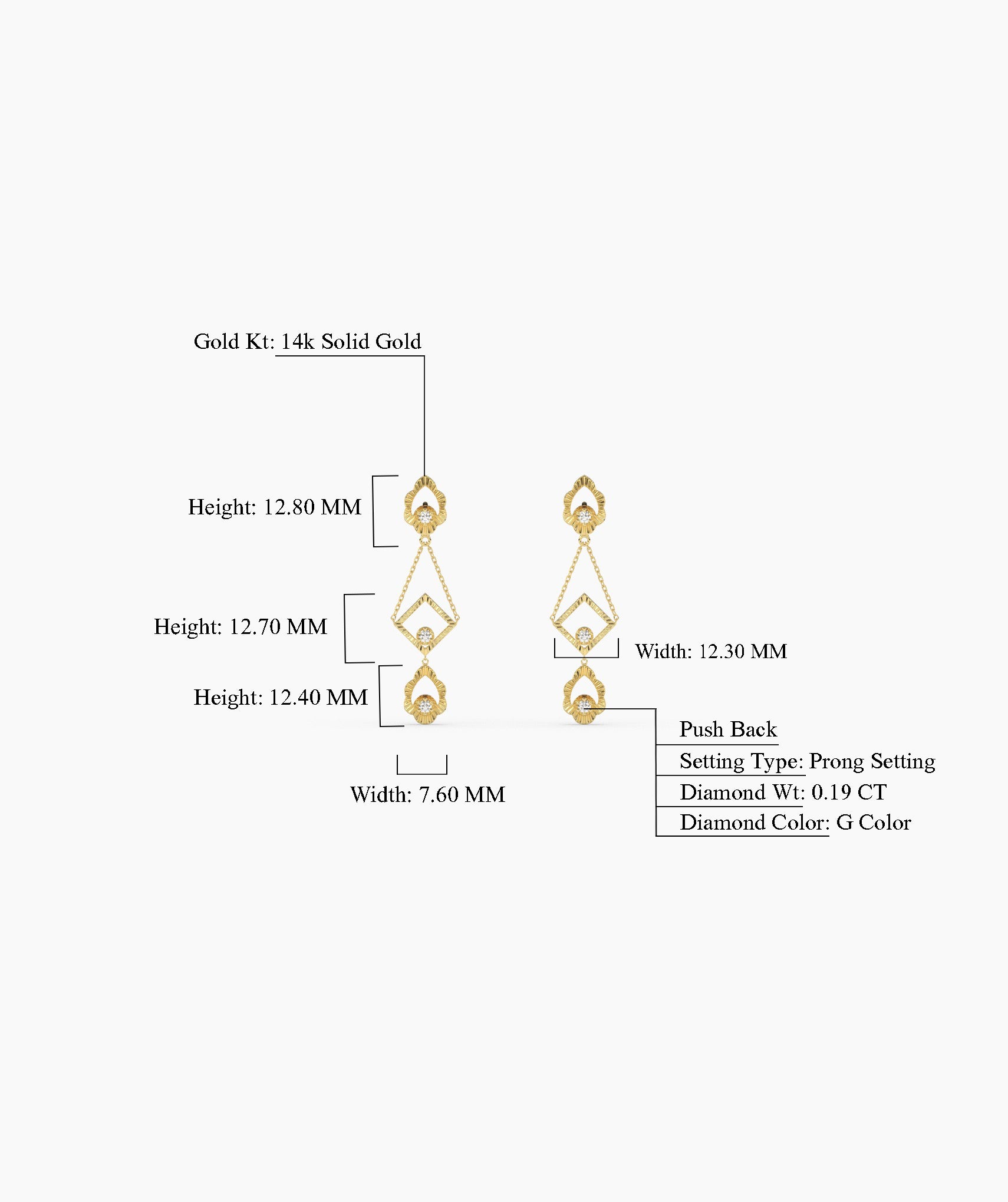 Add a touch of rhythmic elegance to your style with earrings designed to move as you do. These geometric drop earrings feature three distinct tiers a scalloped stud, an open square frame, and a textured teardrop suspended by delicate chains that allow them to sway and catch the light. Handcrafted in 14K solid gold with a signature ribbed finish, they are accented by 0.19ct of sparkling natural diamonds in precise prong settings. Available in yellow, white, and rose gold, these lightweight drops strike the perfect balance between a bold statement and everyday comfort, making them ideal for transitioning from office hours to evening events.