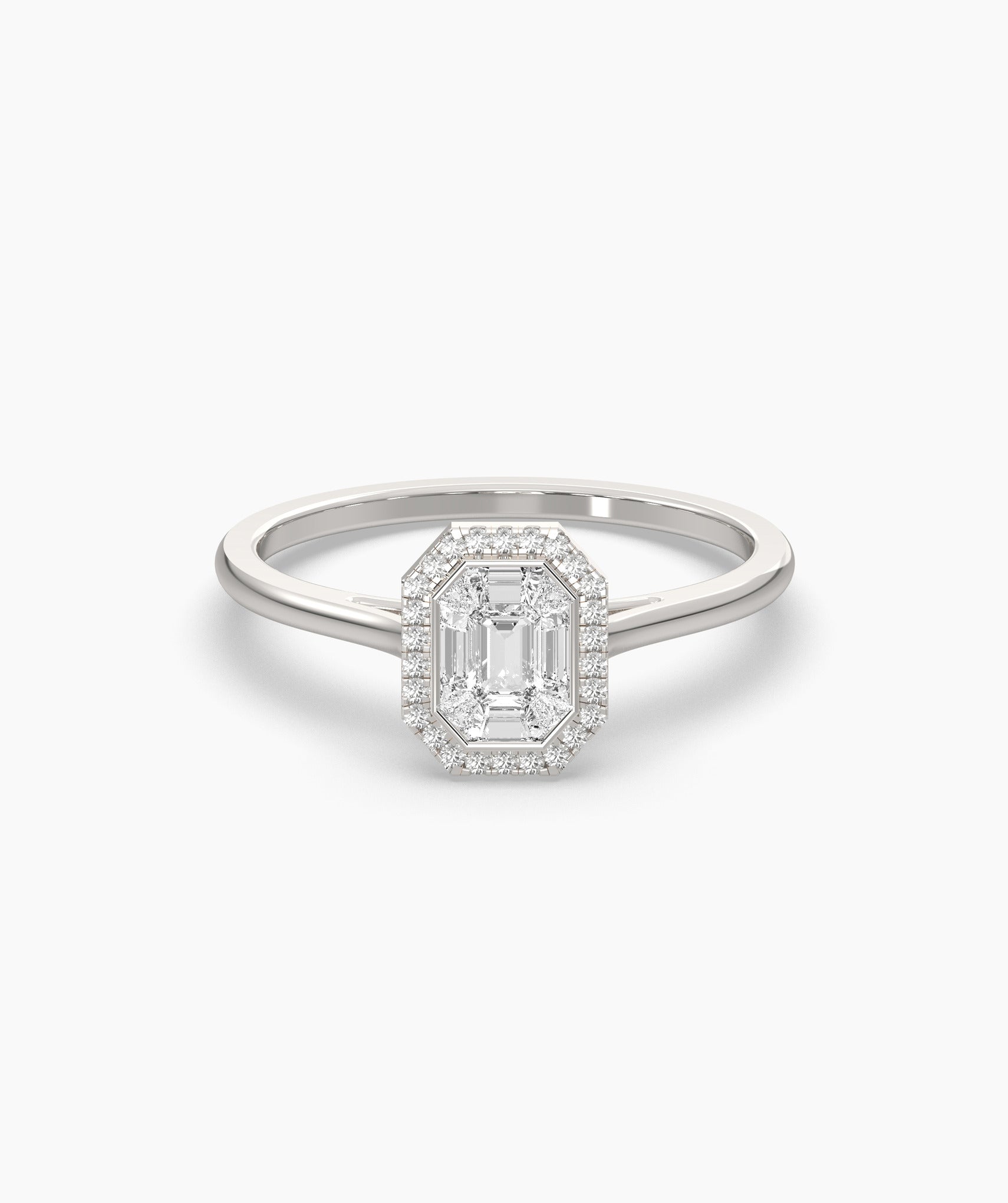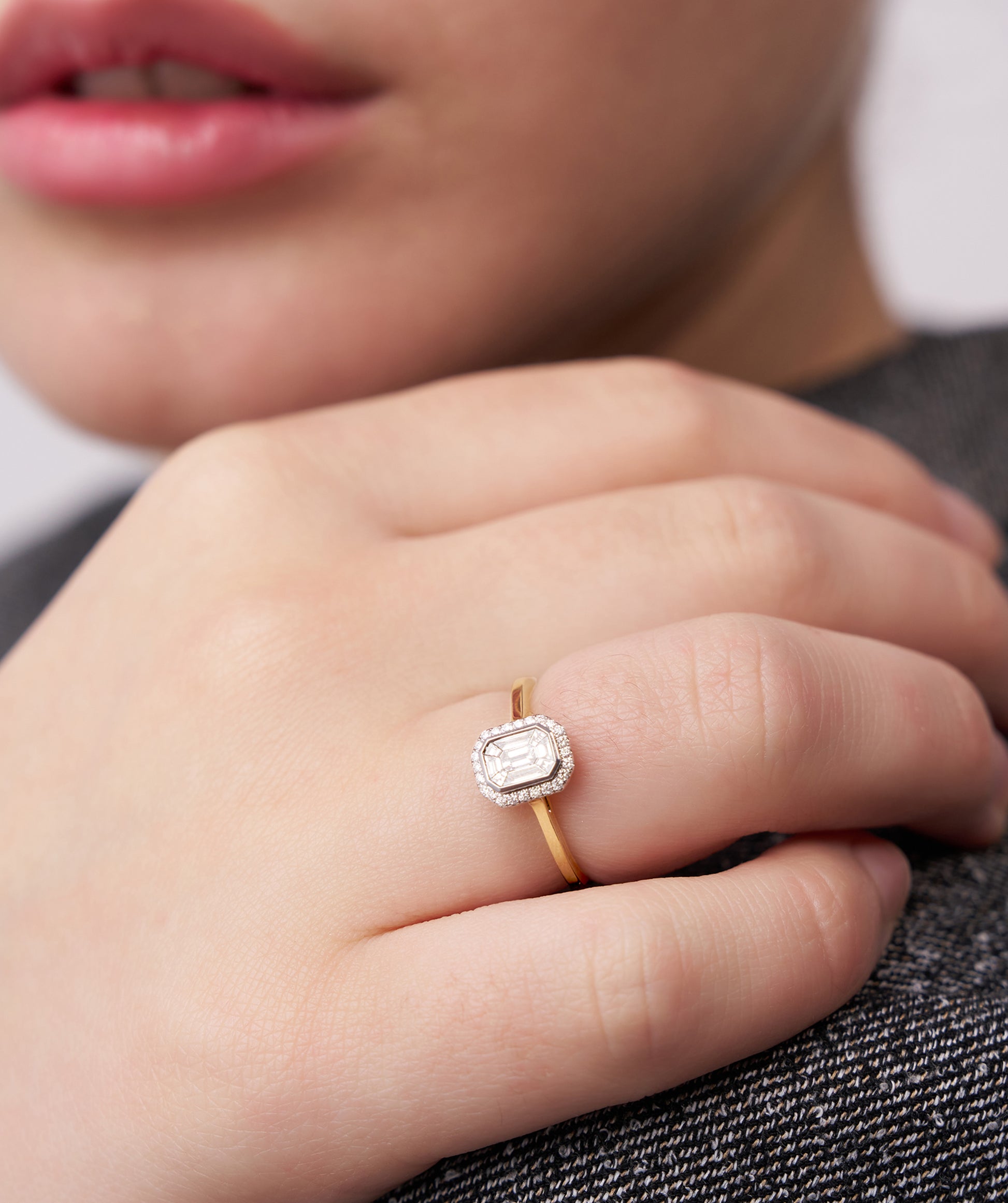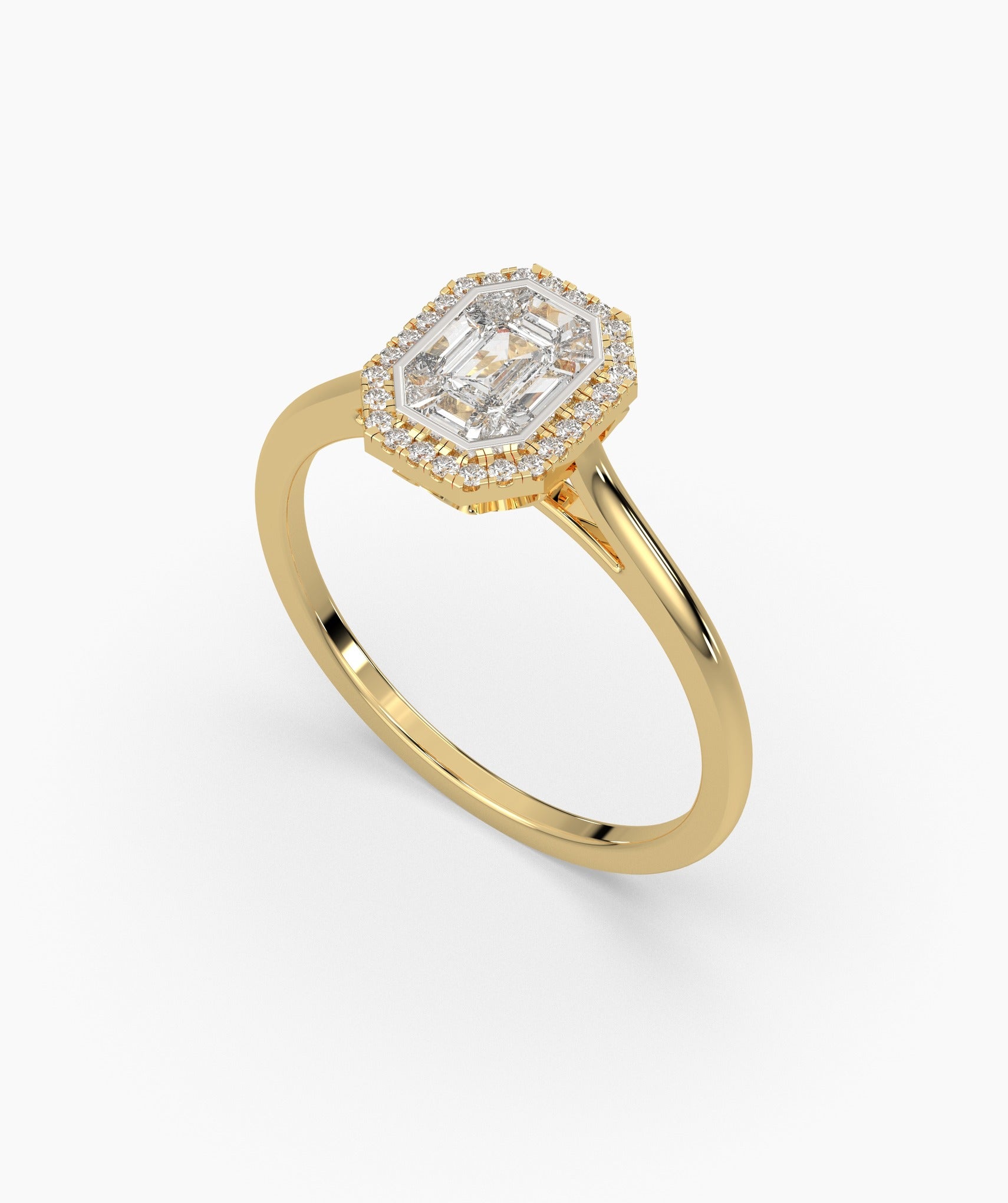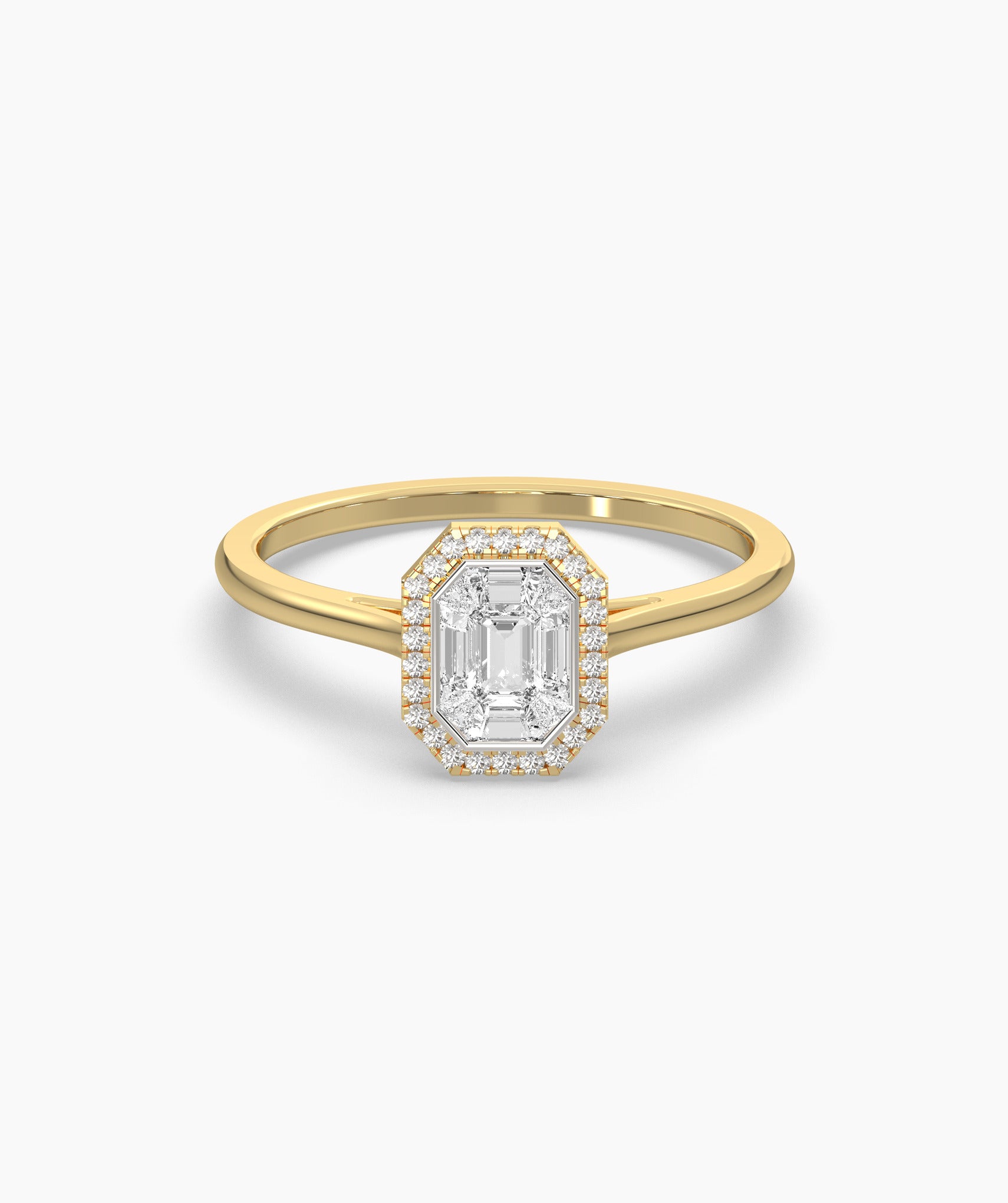 Elevate your style with this sleek 14K gold piece, where the crisp geometry of an emerald-cut diamond meets radiant halo accents.