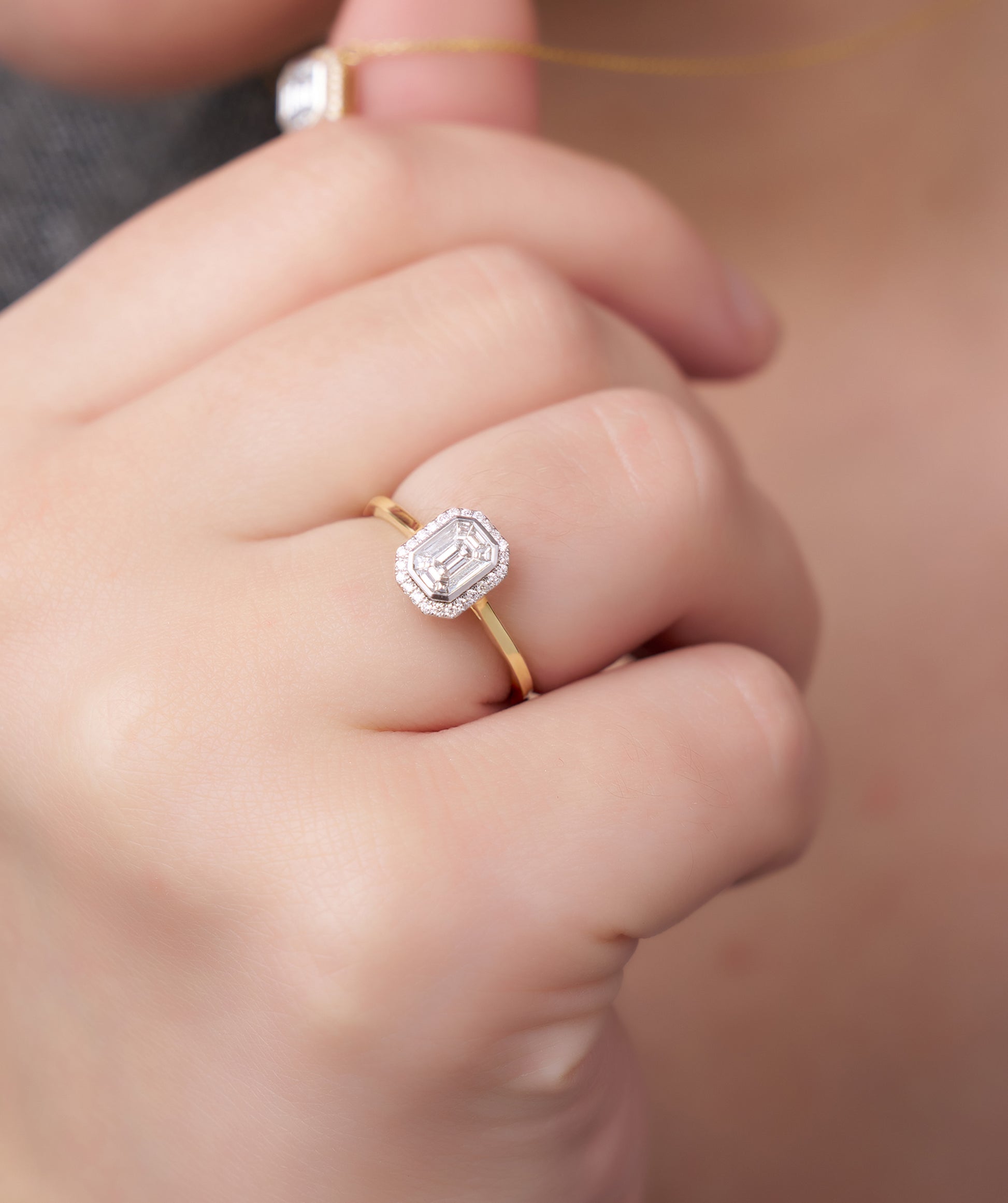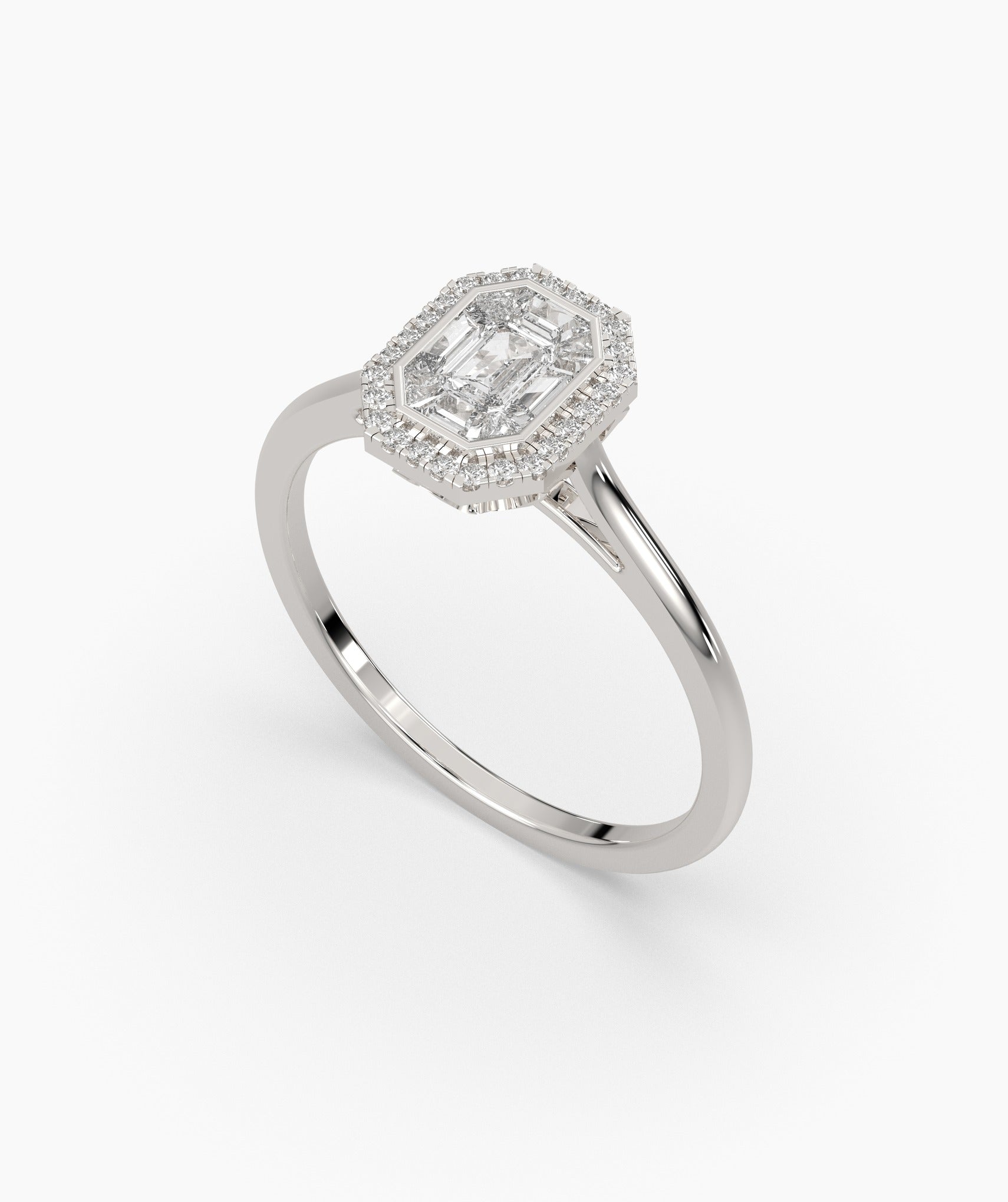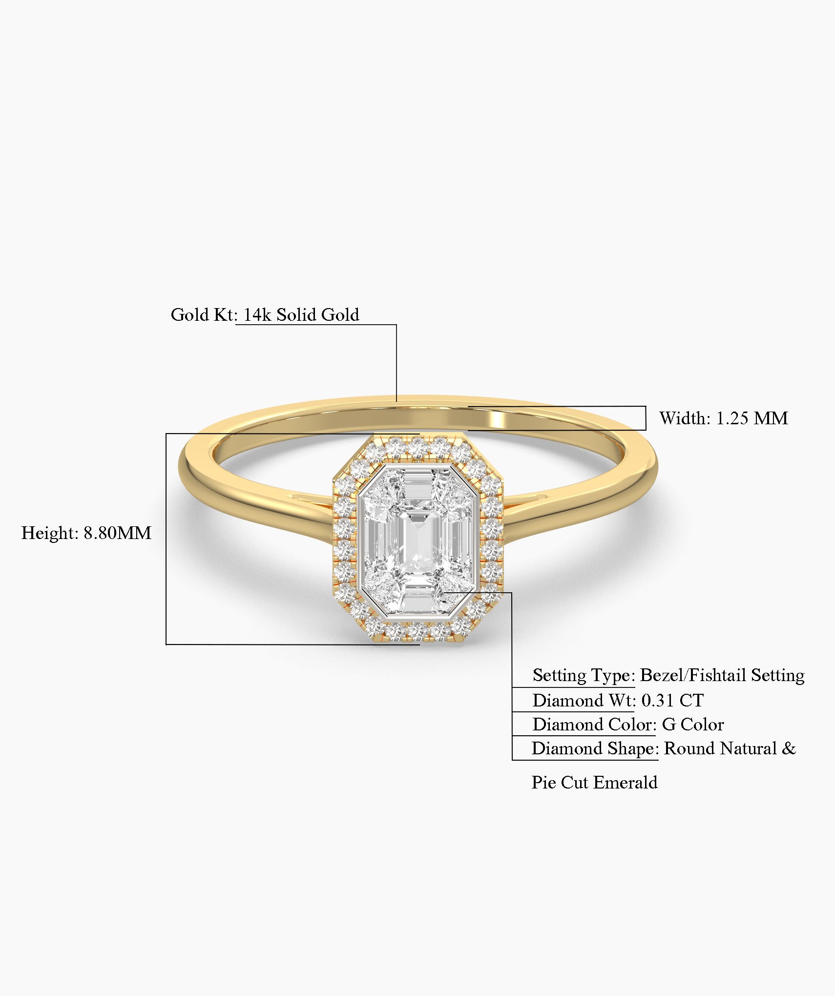 Elevate your style with this sleek 14K gold piece, where the crisp geometry of an emerald-cut diamond meets radiant halo accents.