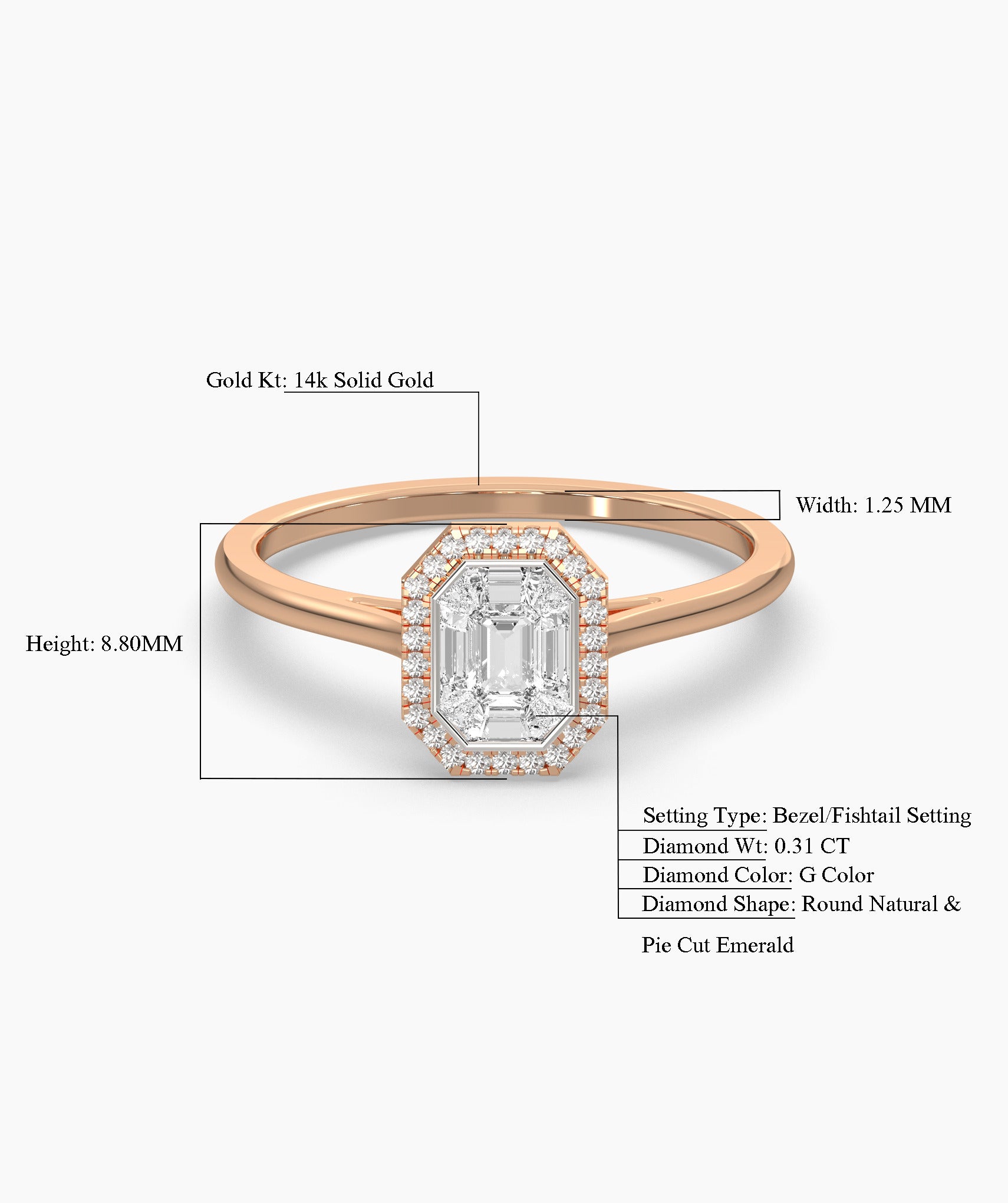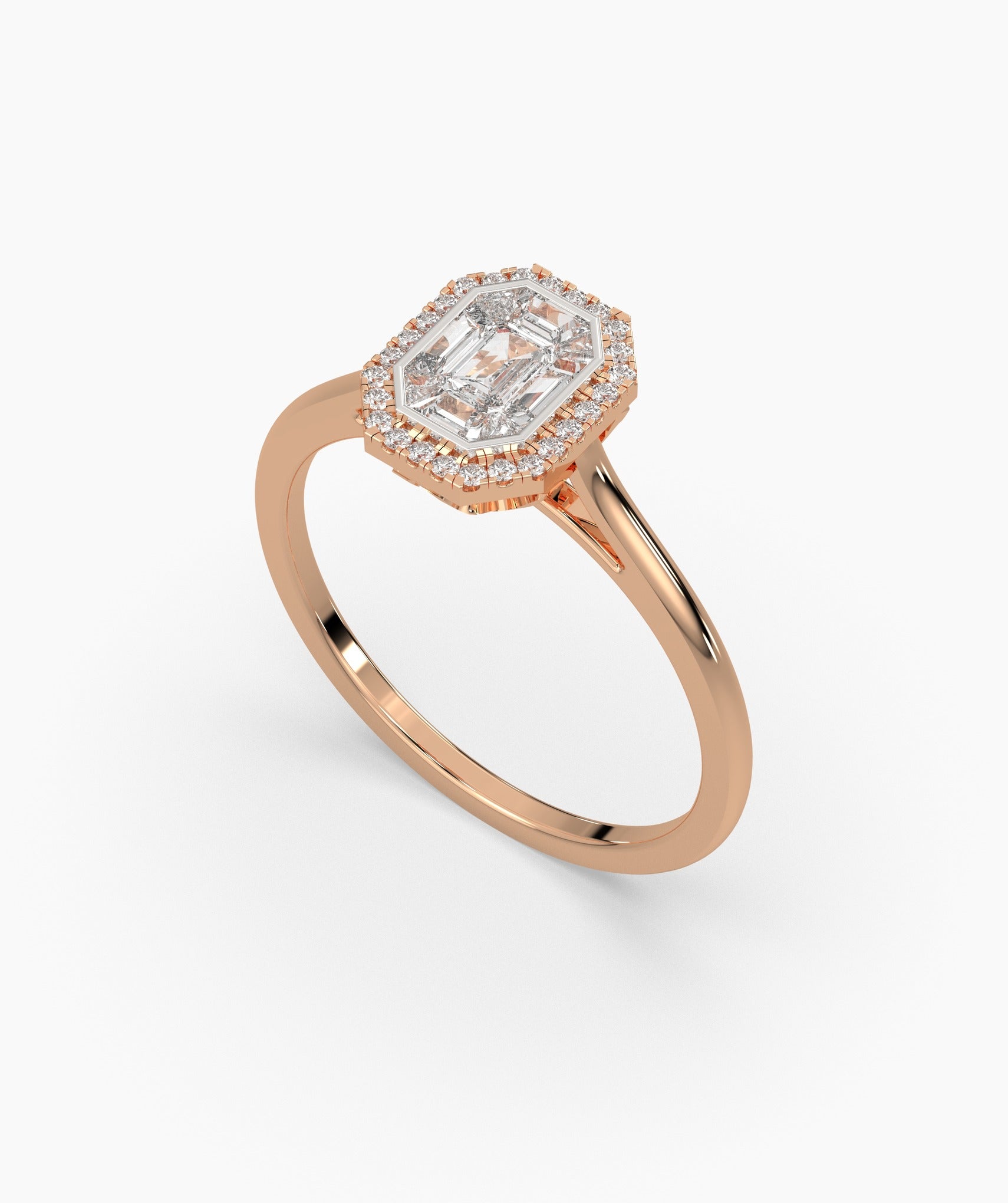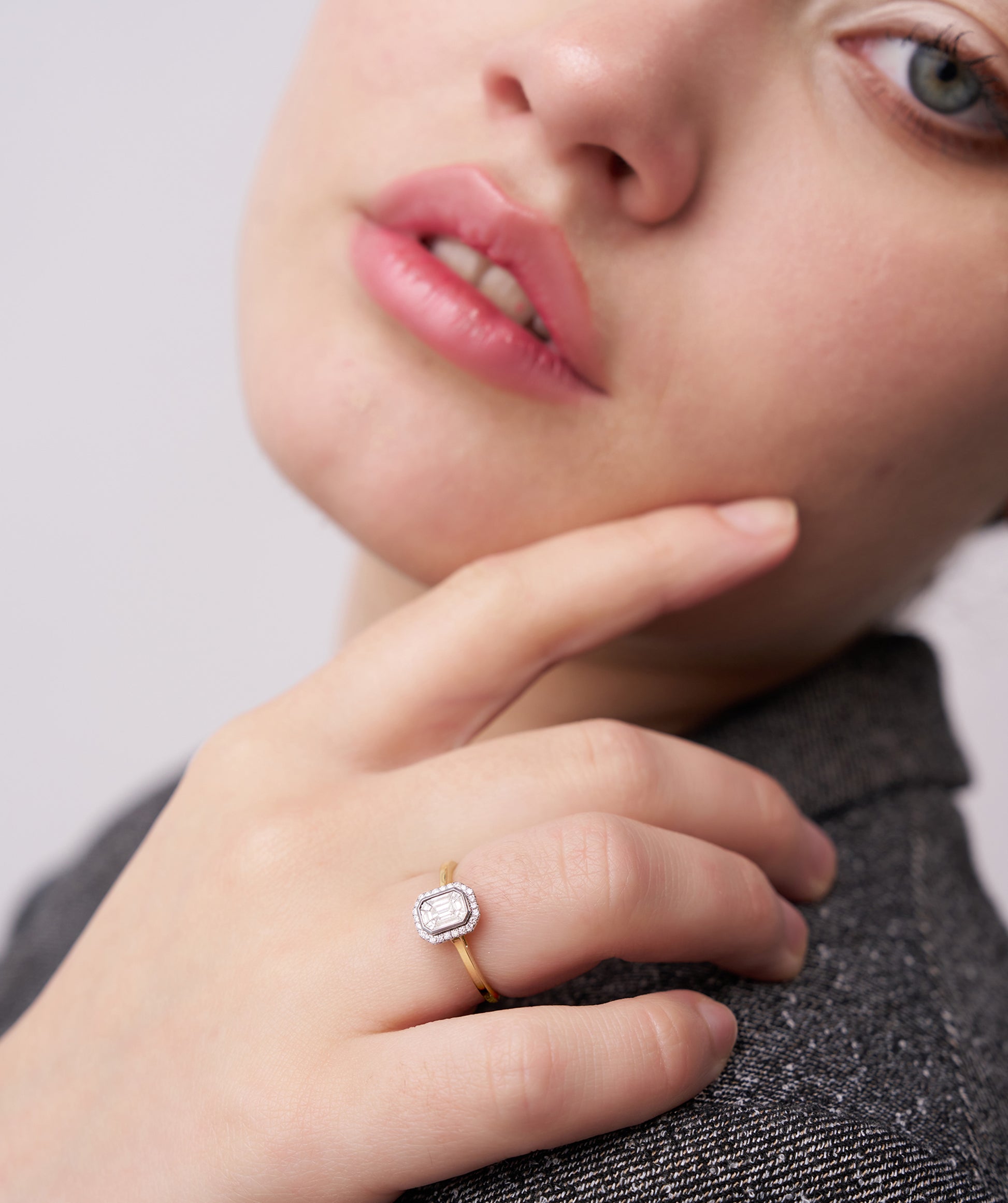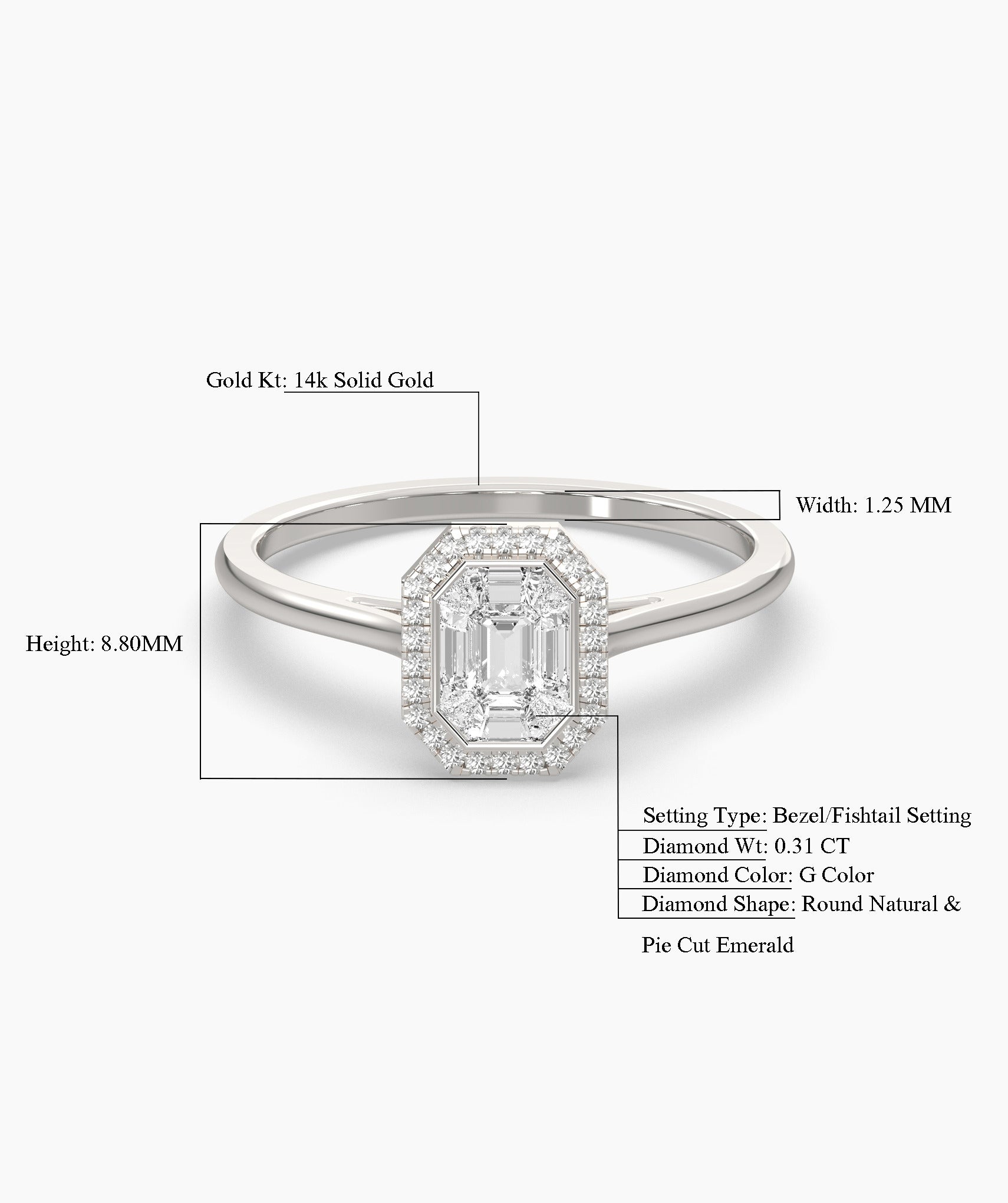 Elevate your style with this sleek 14K gold piece, where the crisp geometry of an emerald-cut diamond meets radiant halo accents.