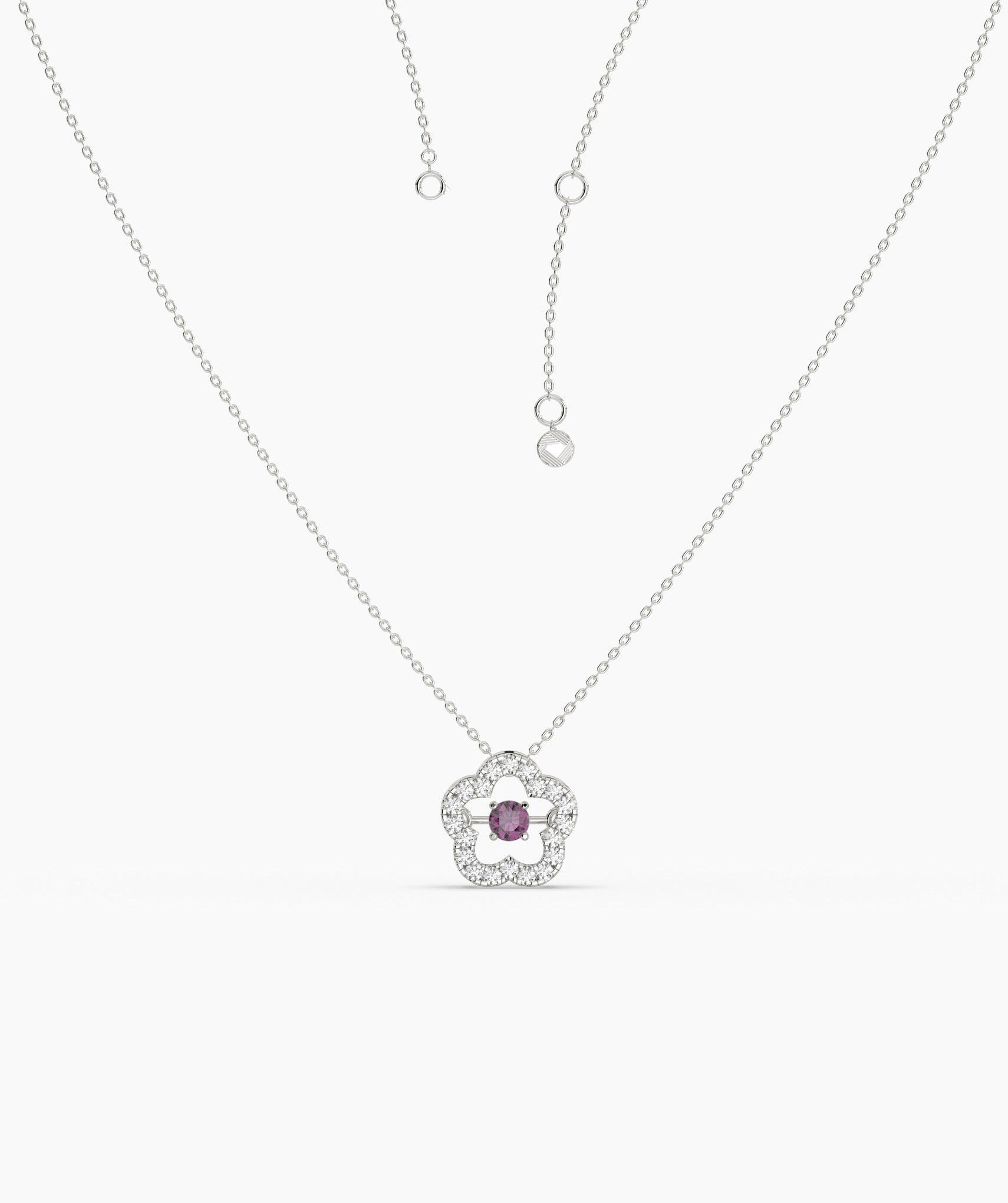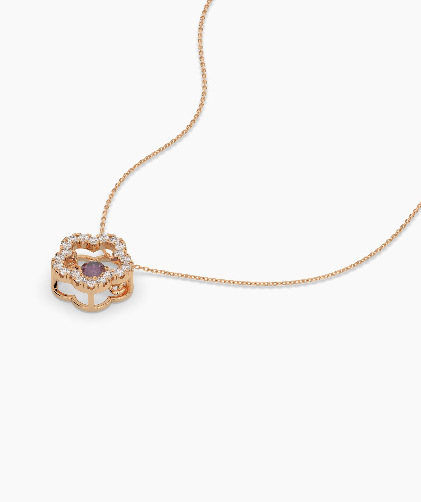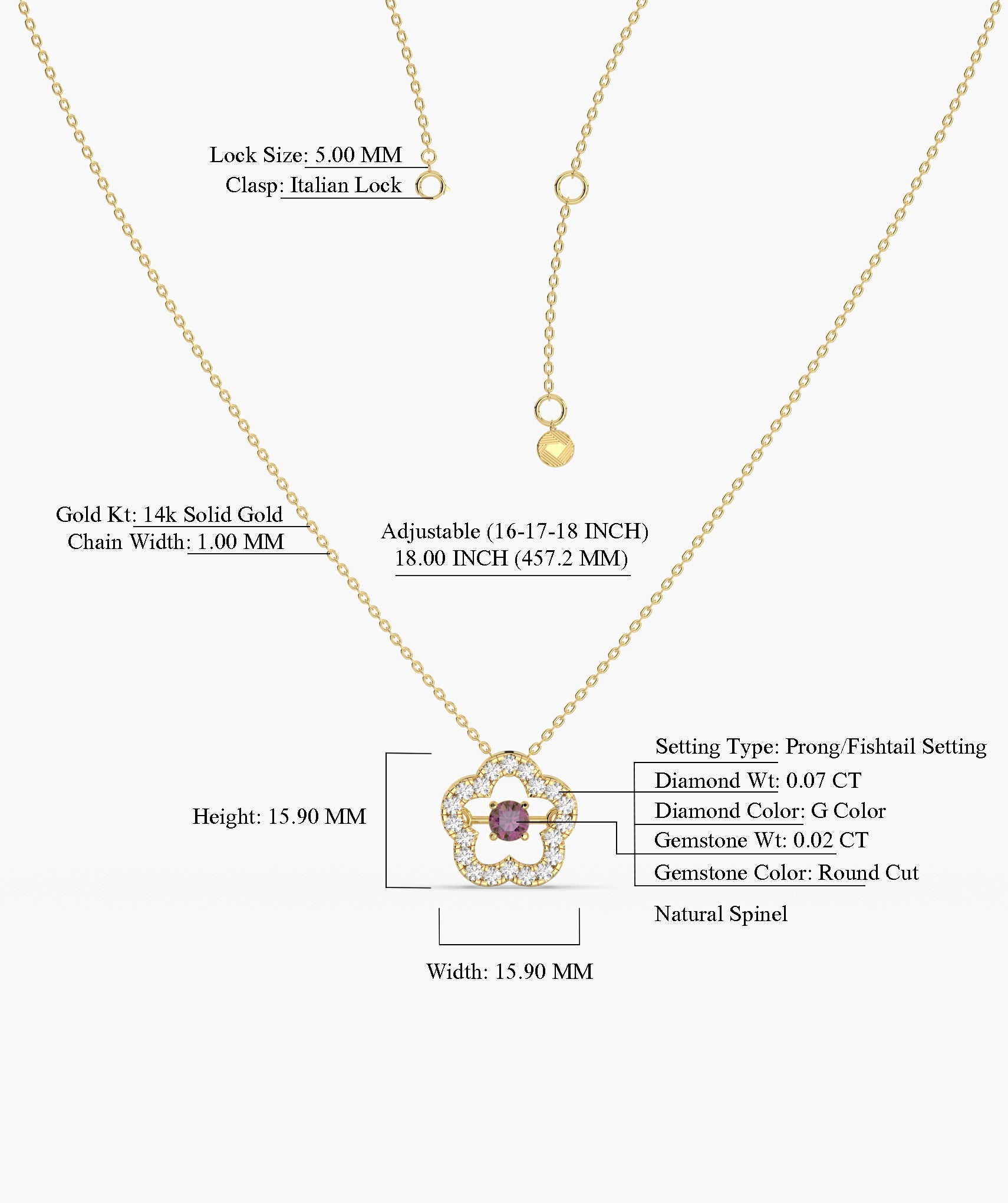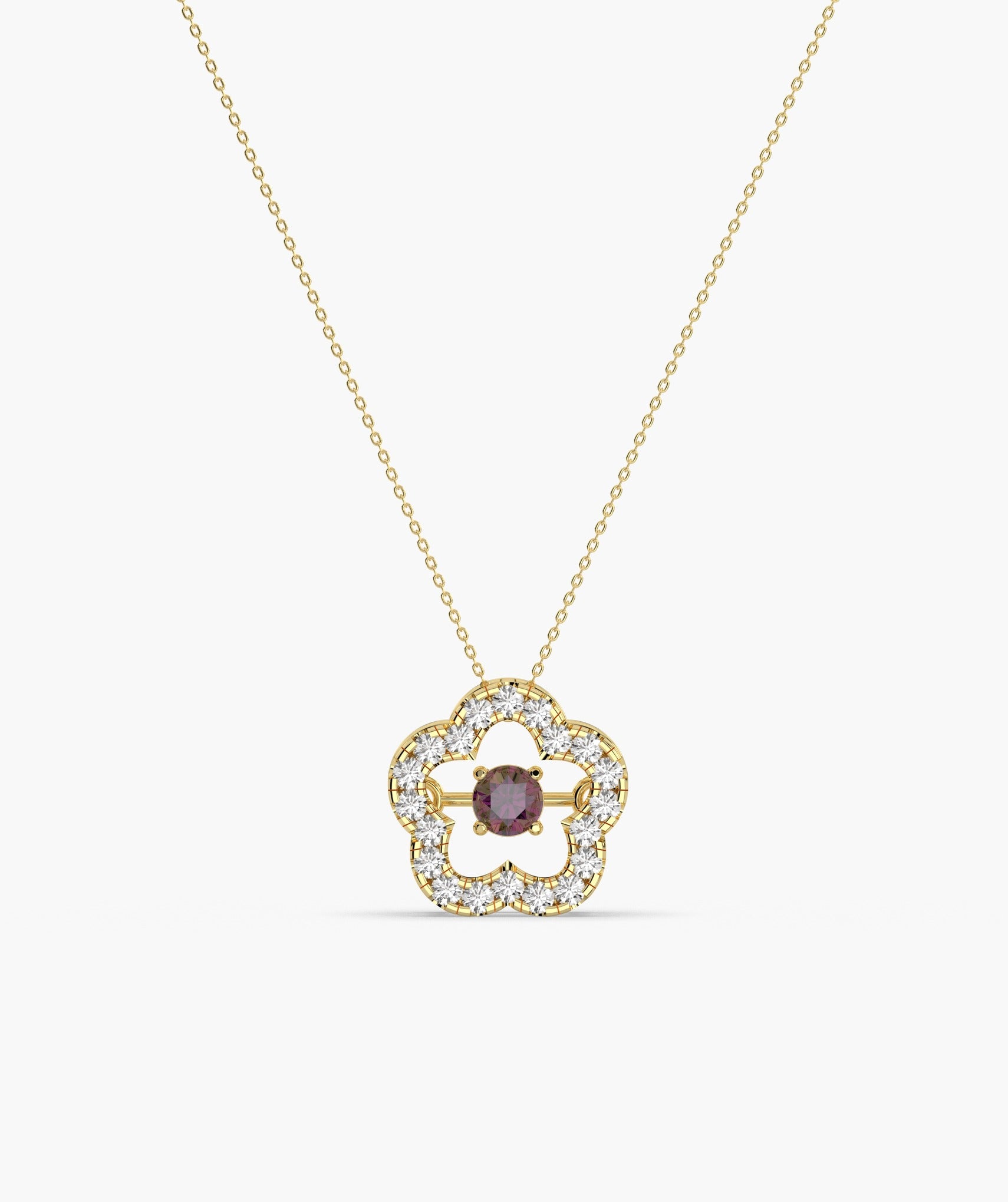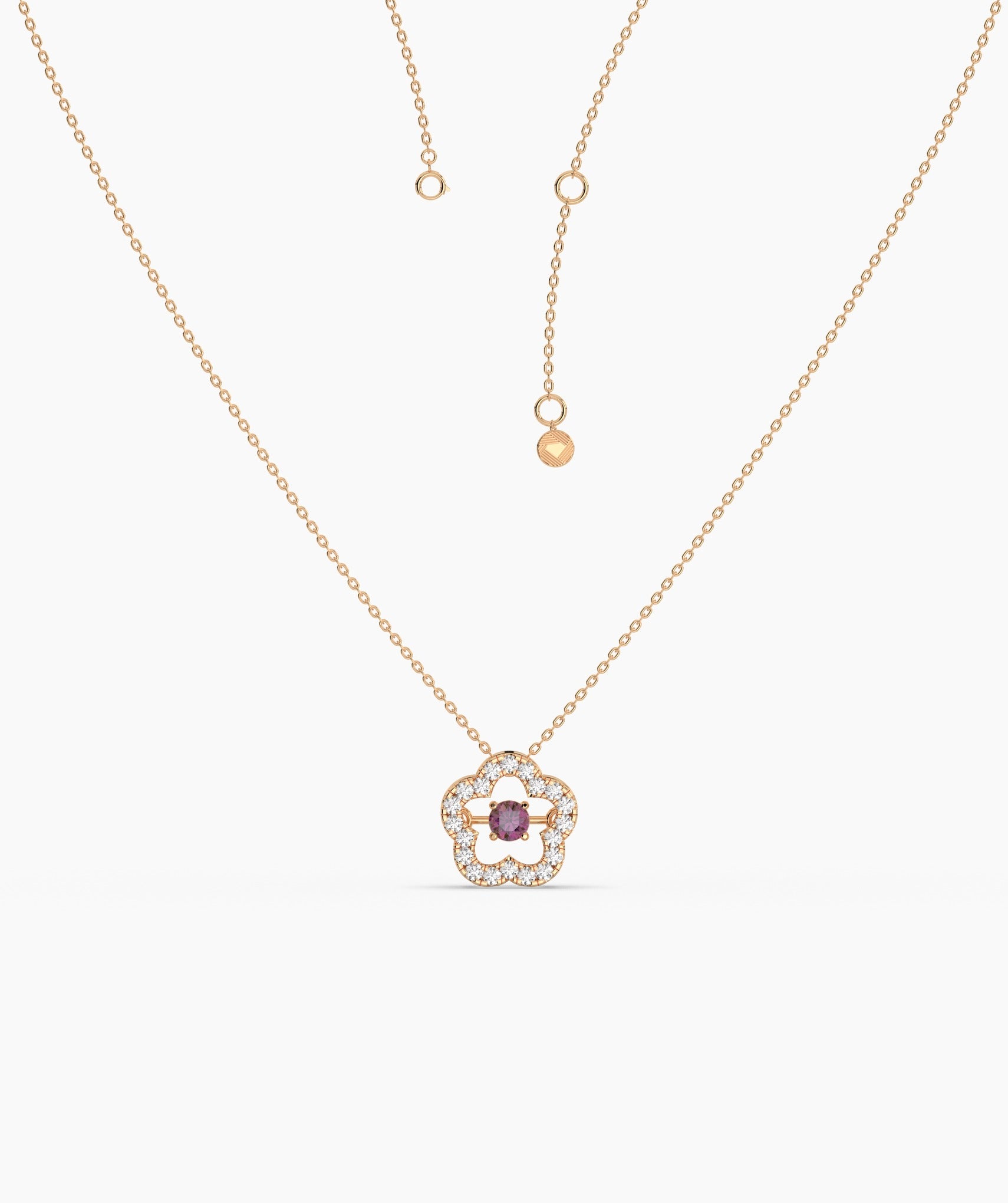 A charming 14K solid gold necklace featuring a flower-shaped pendant encrusted with sparkling diamonds and a central pink diamonds.