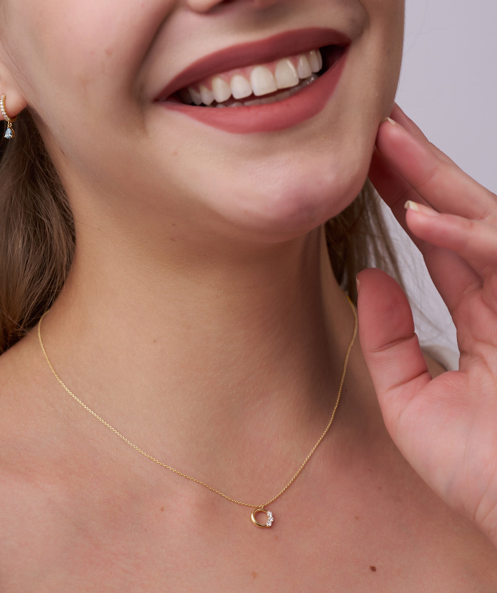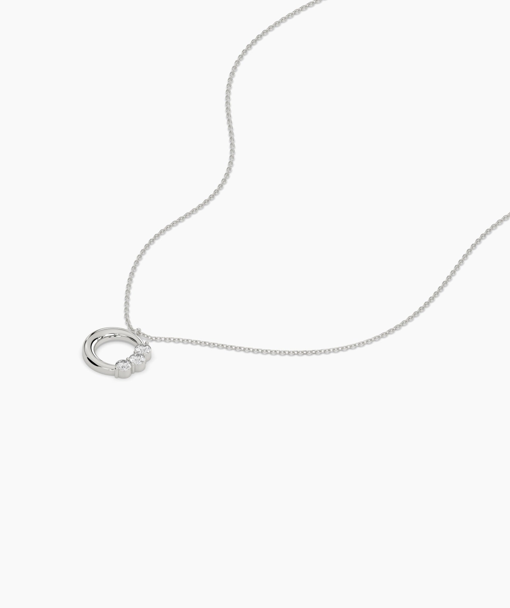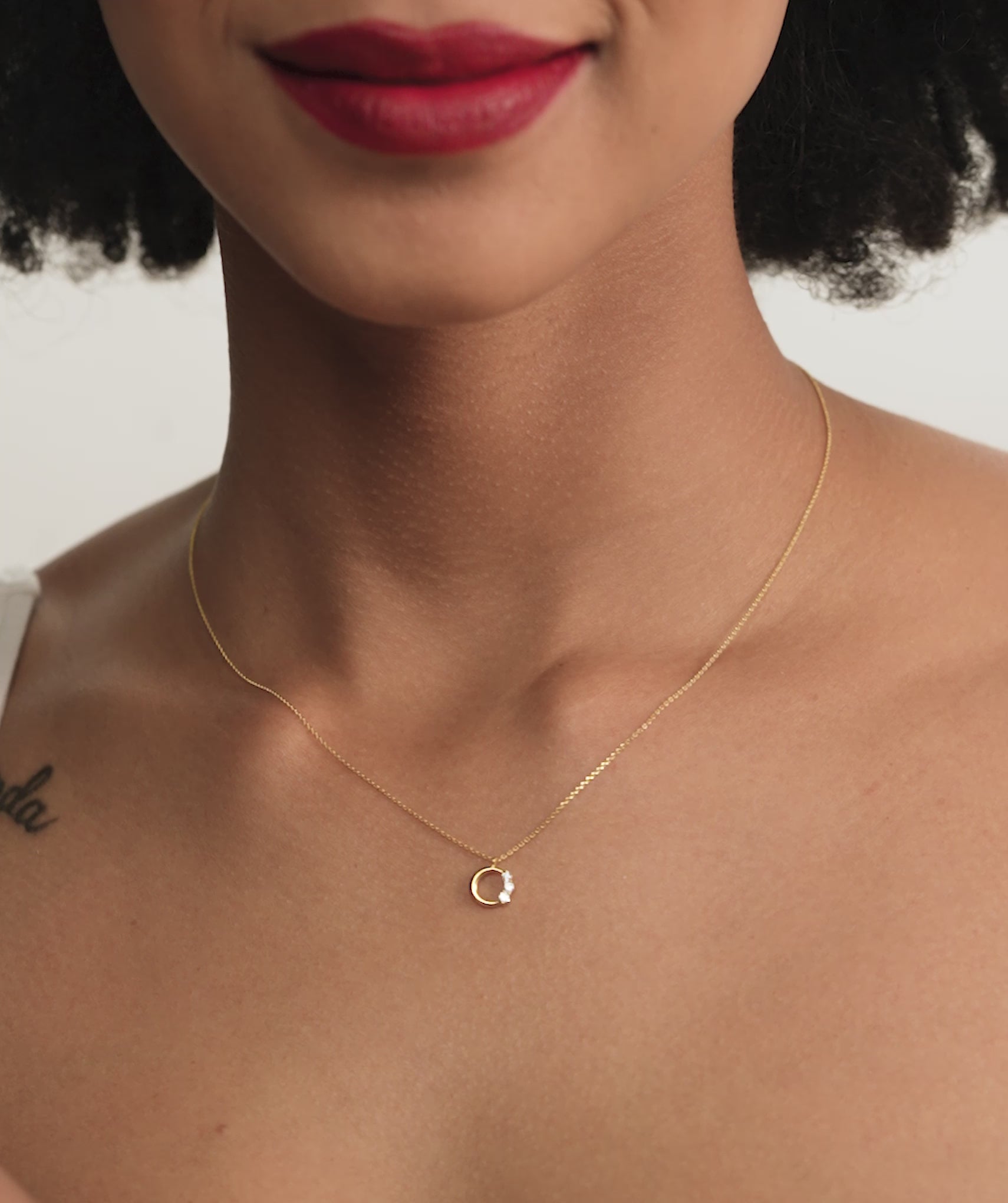 Elevate any ensemble with this partial-circle pendant, crafted in solid gold and adorned with a trio of dazzling diamonds.