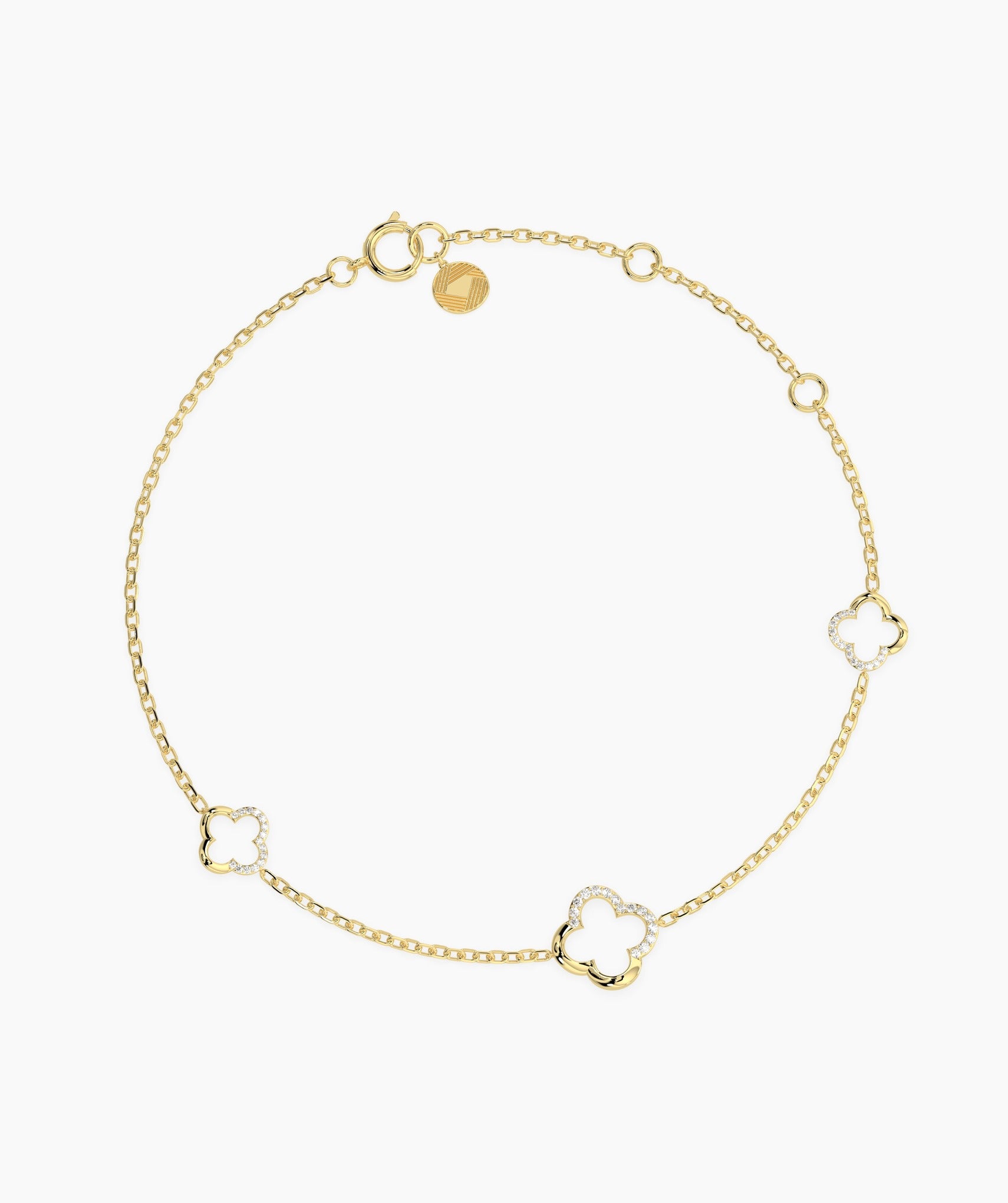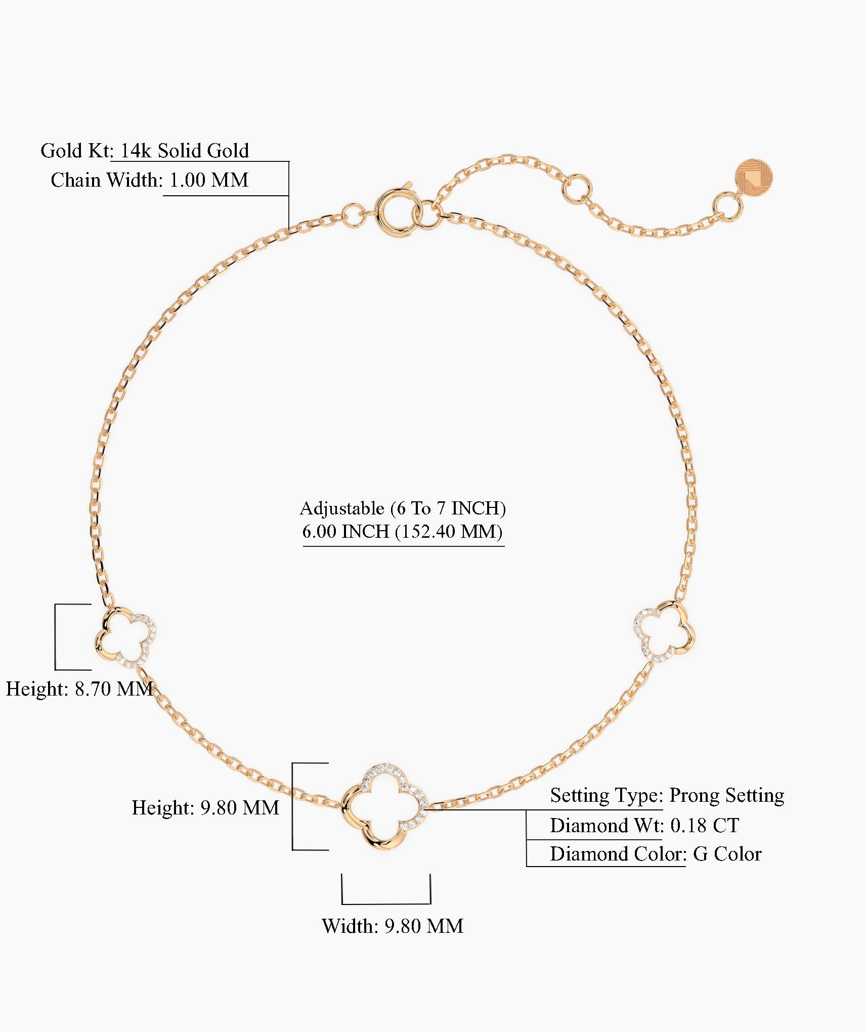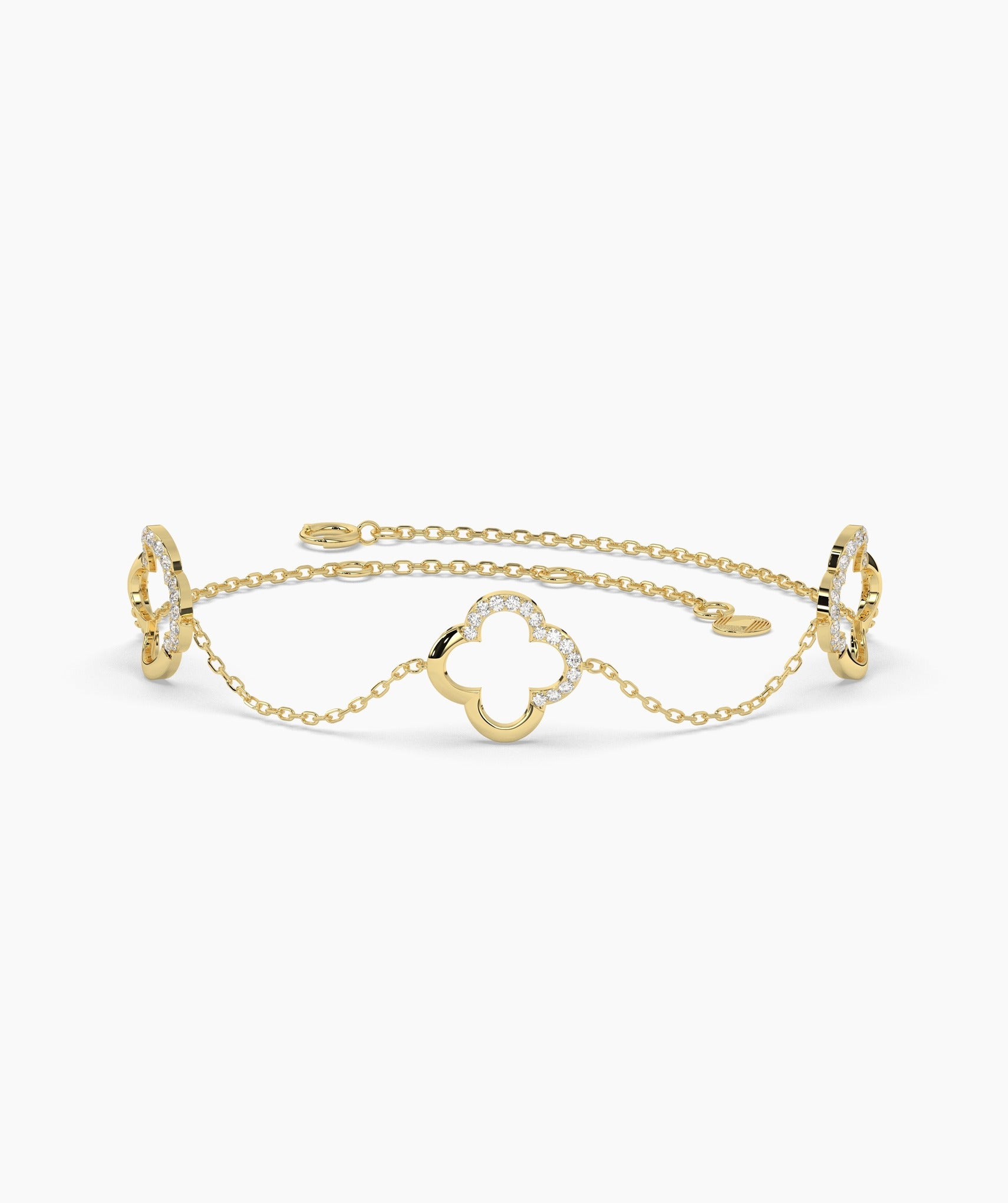 This delightful 14K solid gold bracelet features three clover charms, each outlined with shimmering diamonds to enhance their shape and allure.