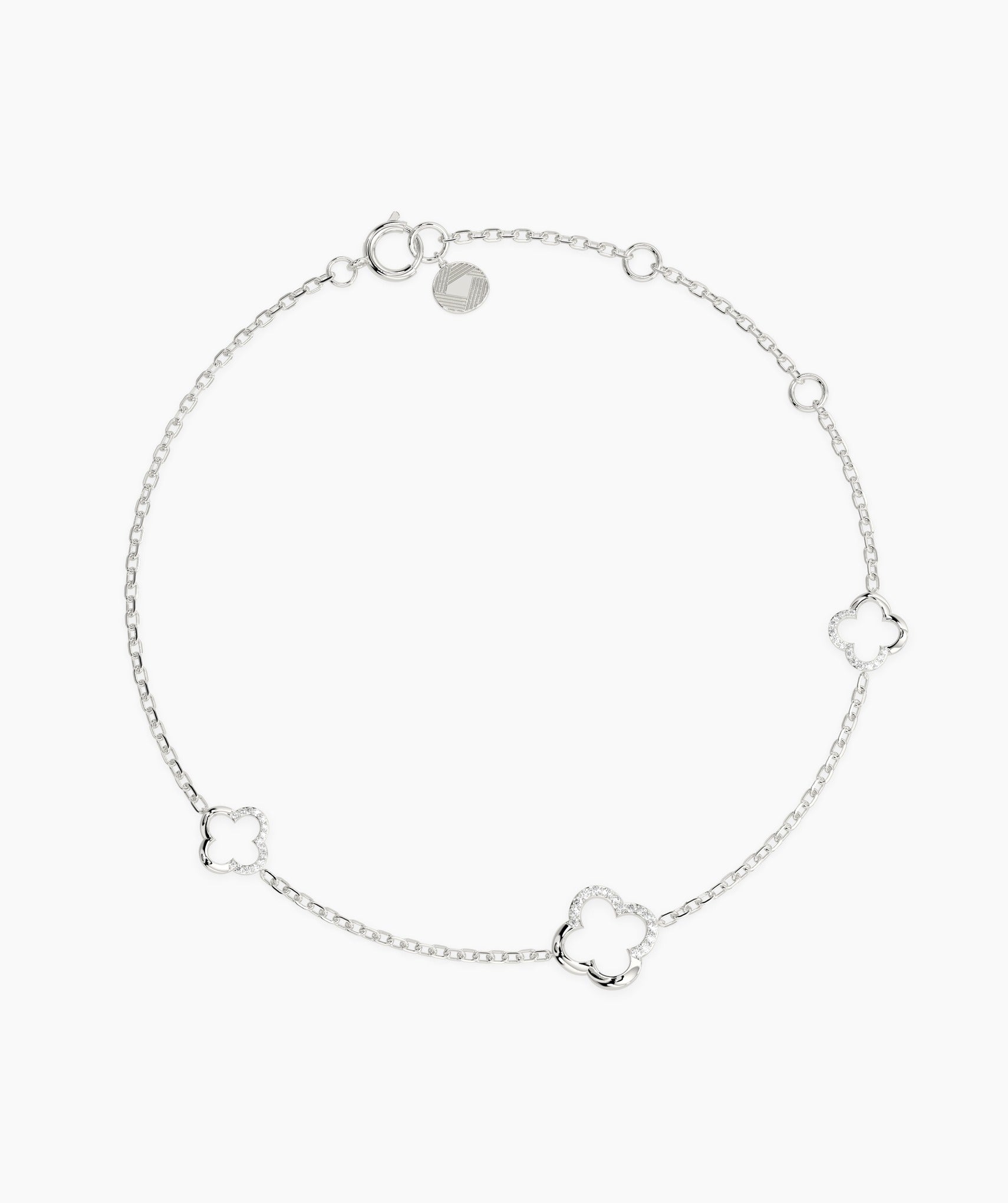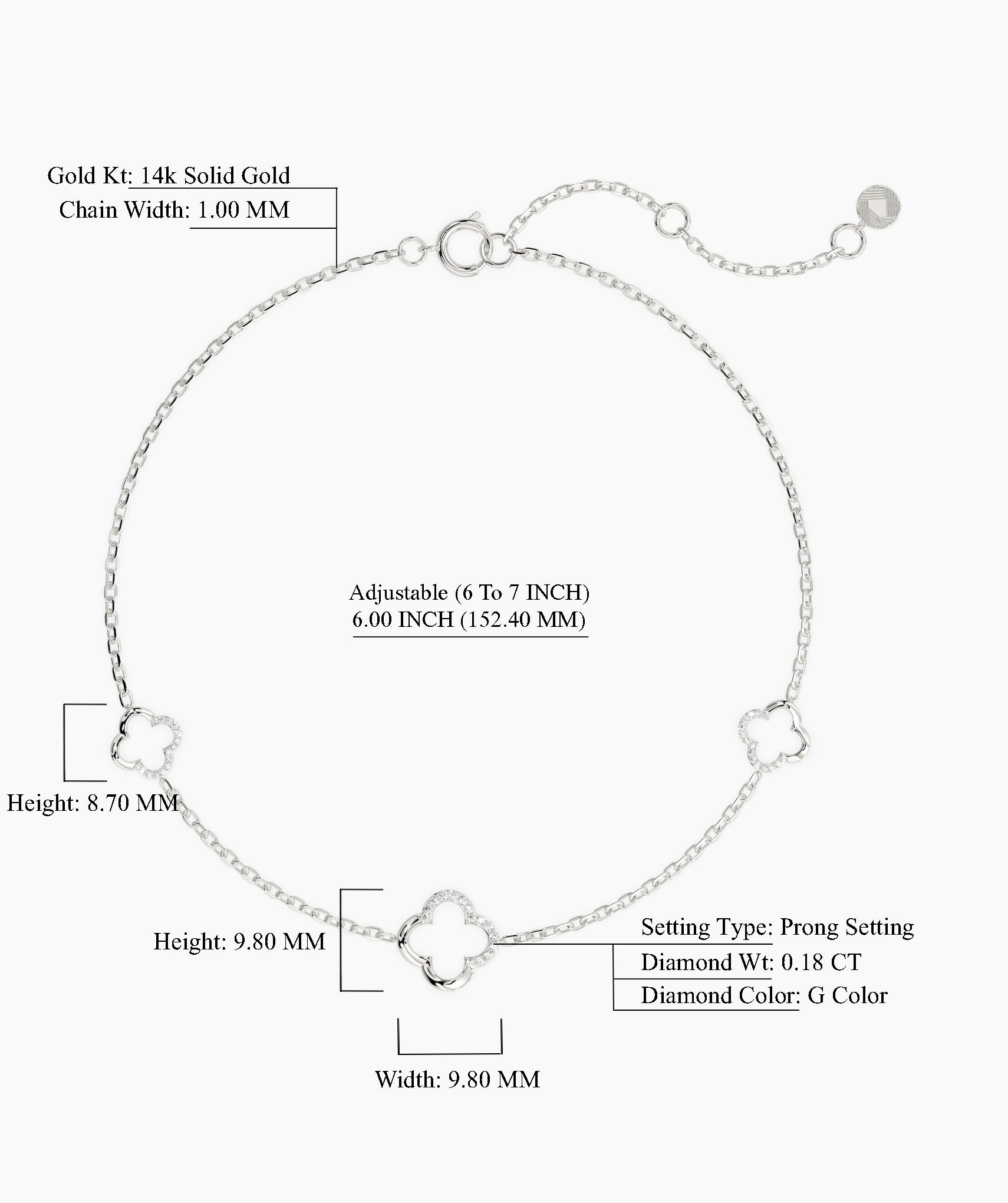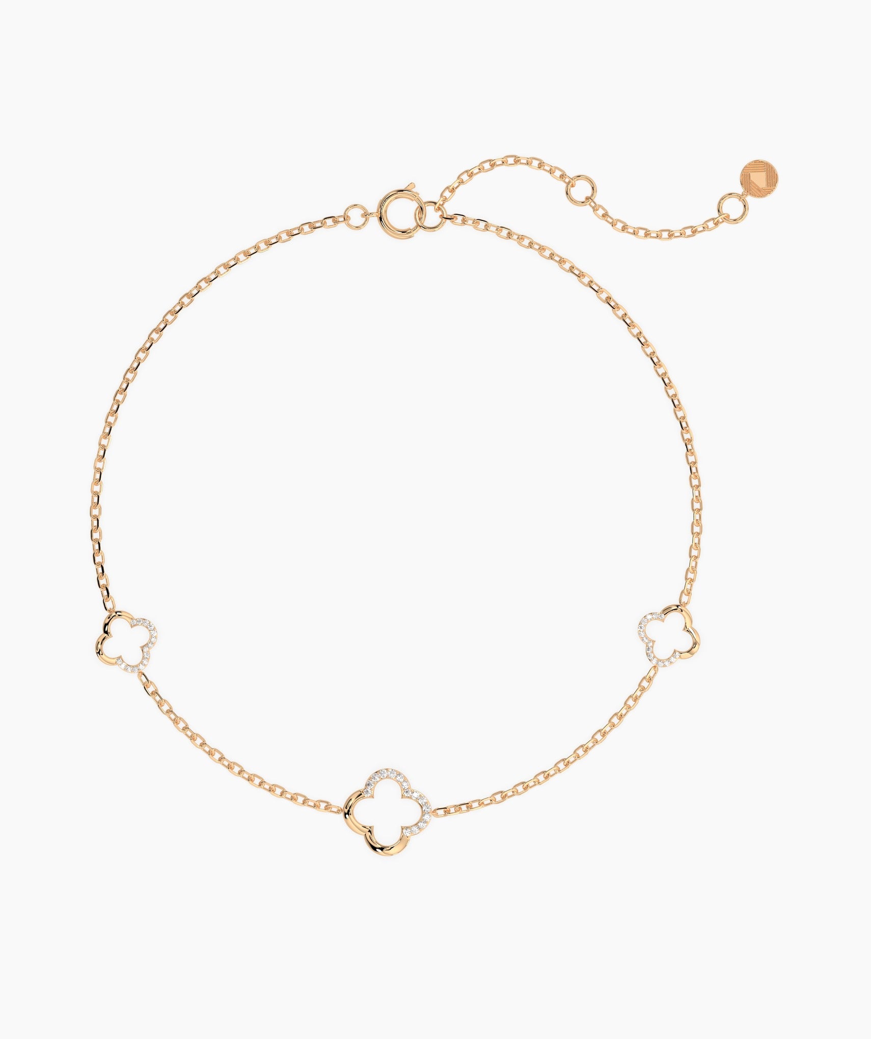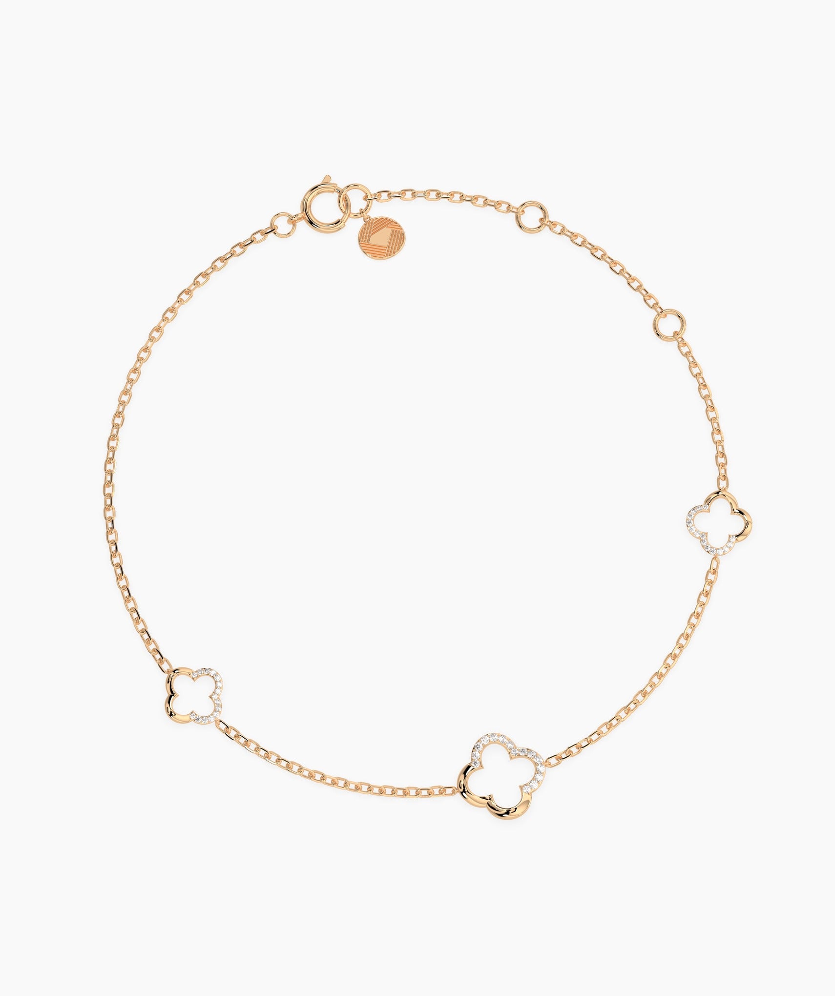 This delightful 14K solid gold bracelet features three clover charms, each outlined with shimmering diamonds to enhance their shape and allure.