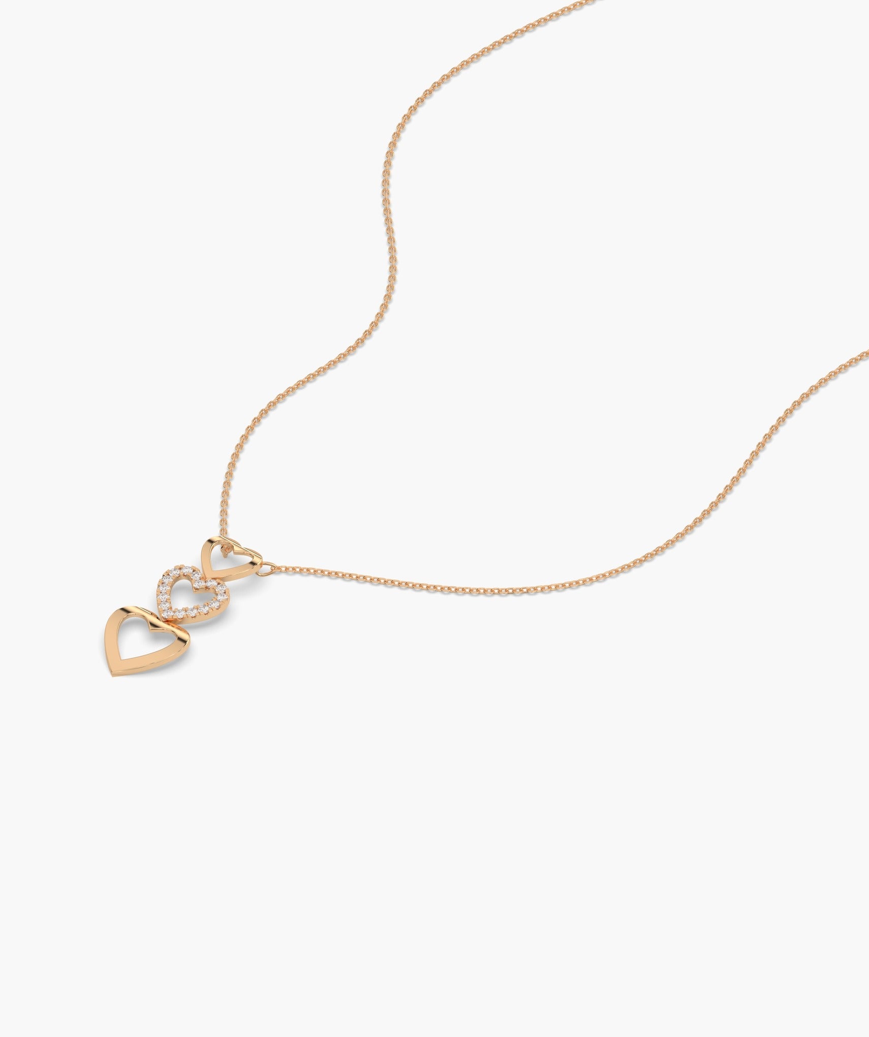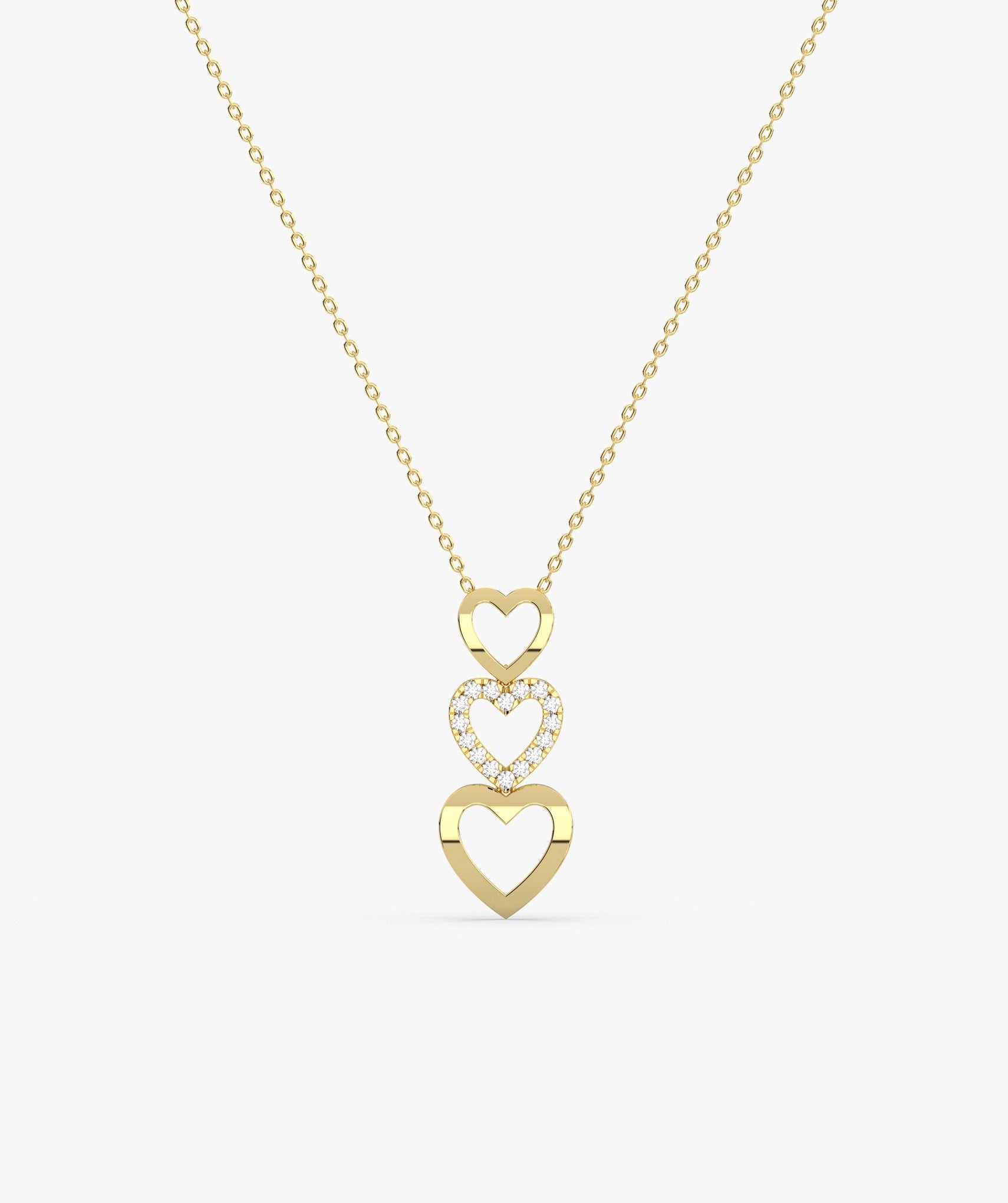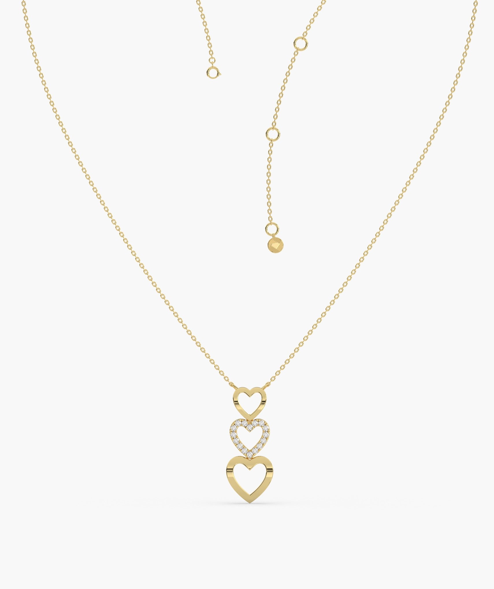 Charming 14K gold necklace featuring a trio of hearts, with the central heart adorned in diamonds, symbolizing love's growing beauty.