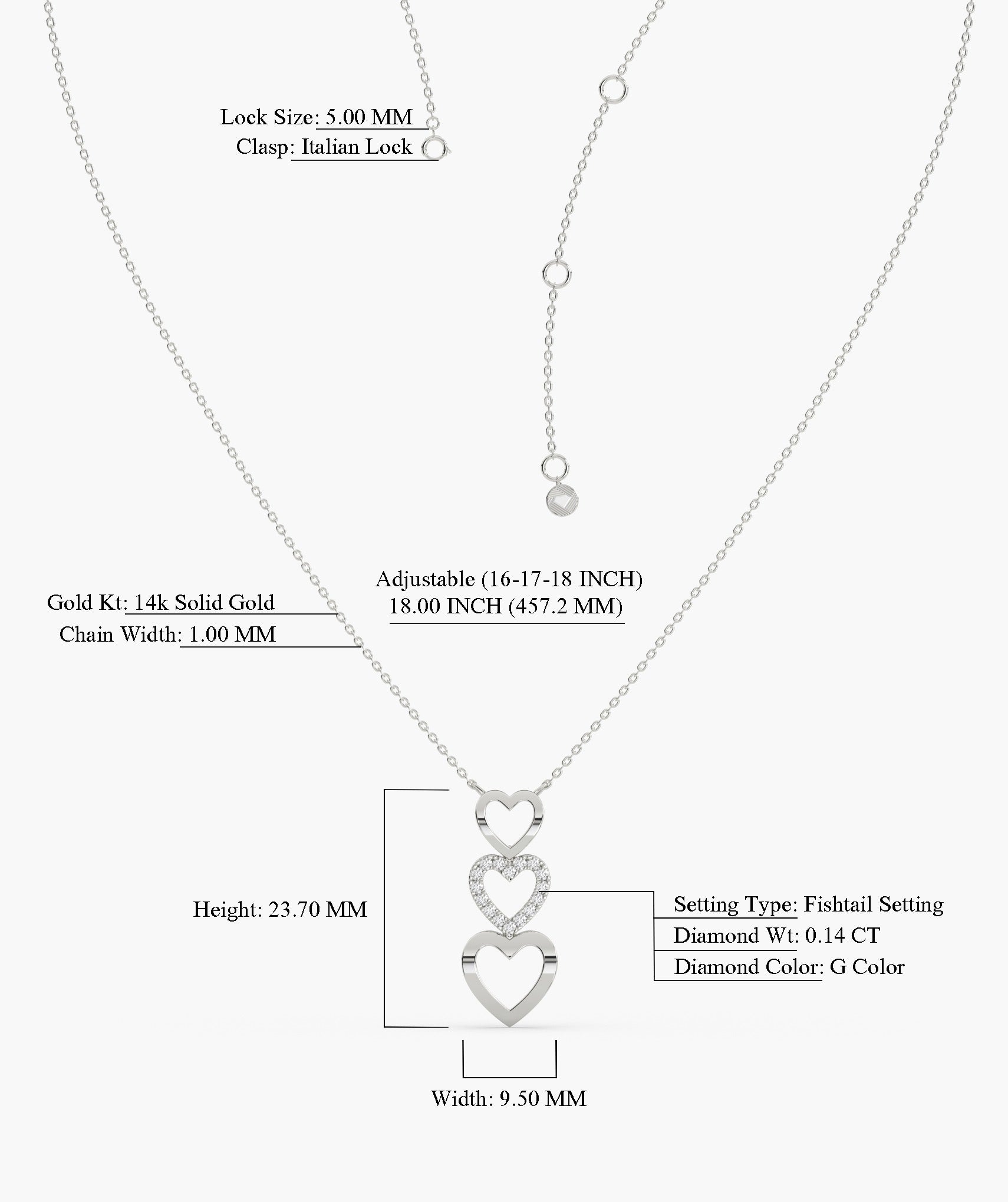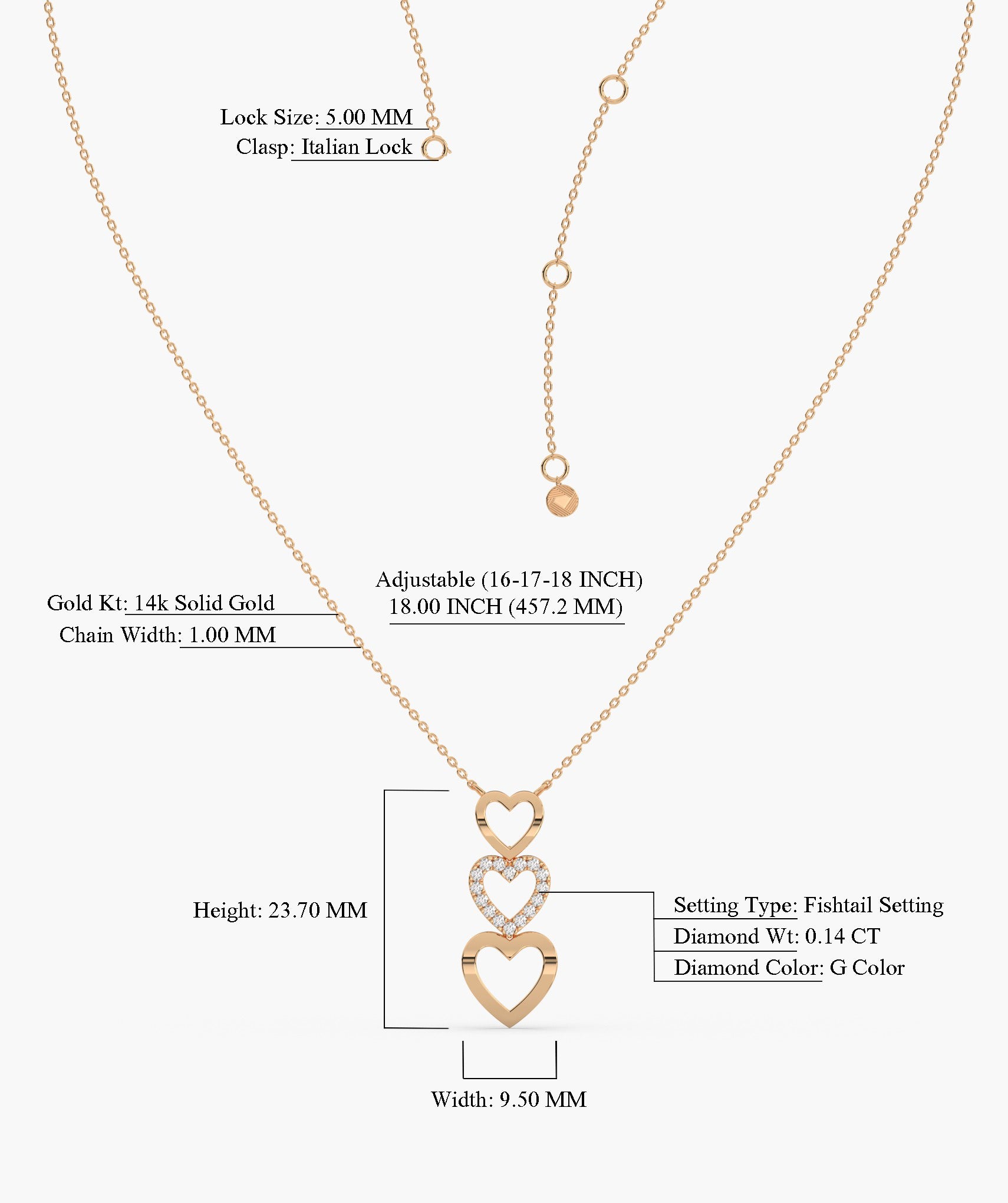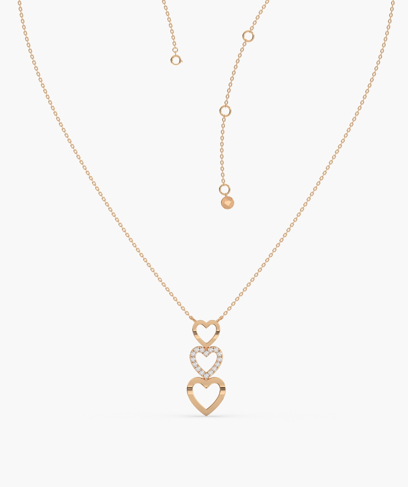 Charming 14K gold necklace featuring a trio of hearts, with the central heart adorned in diamonds, symbolizing love's growing beauty.