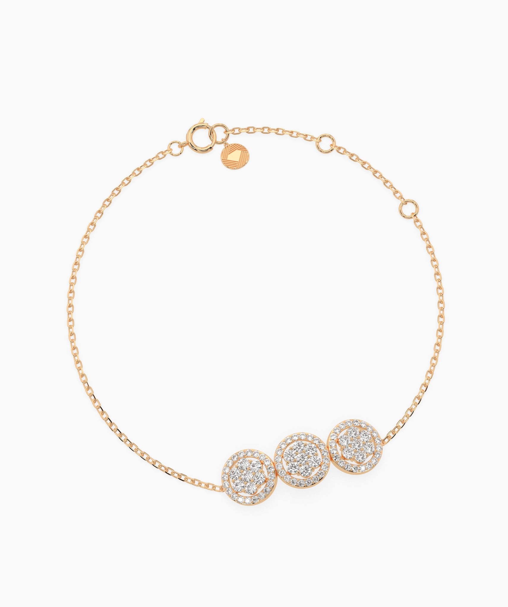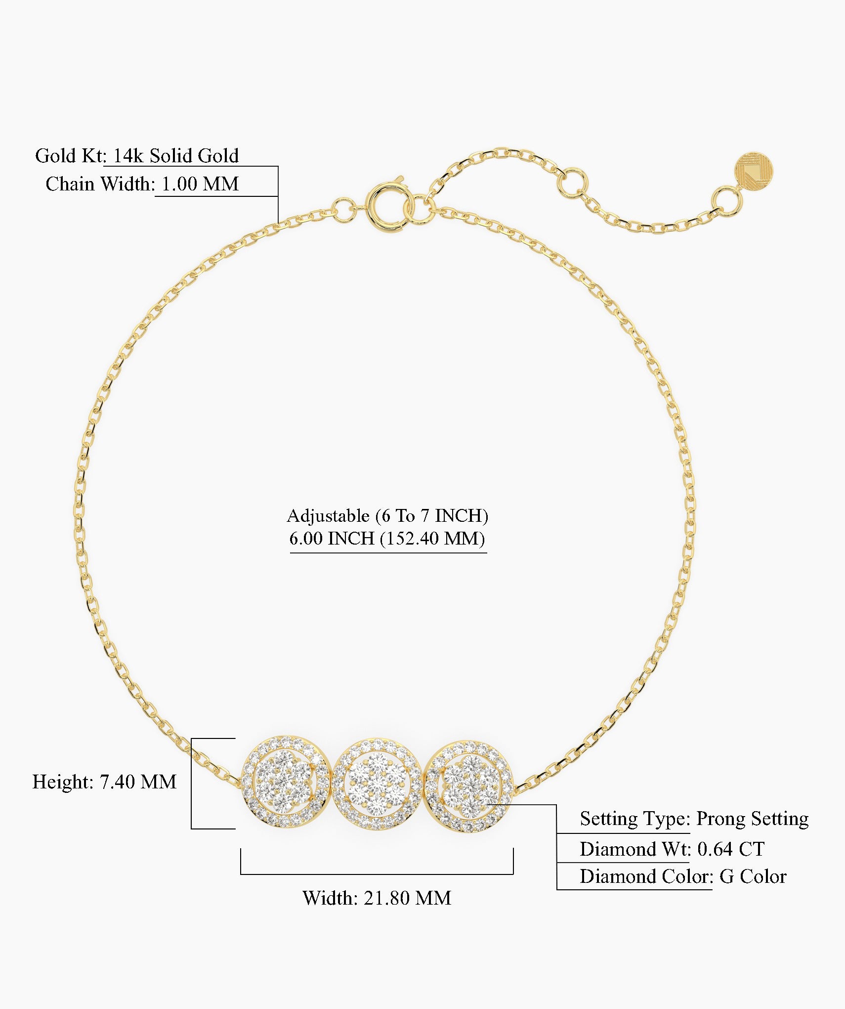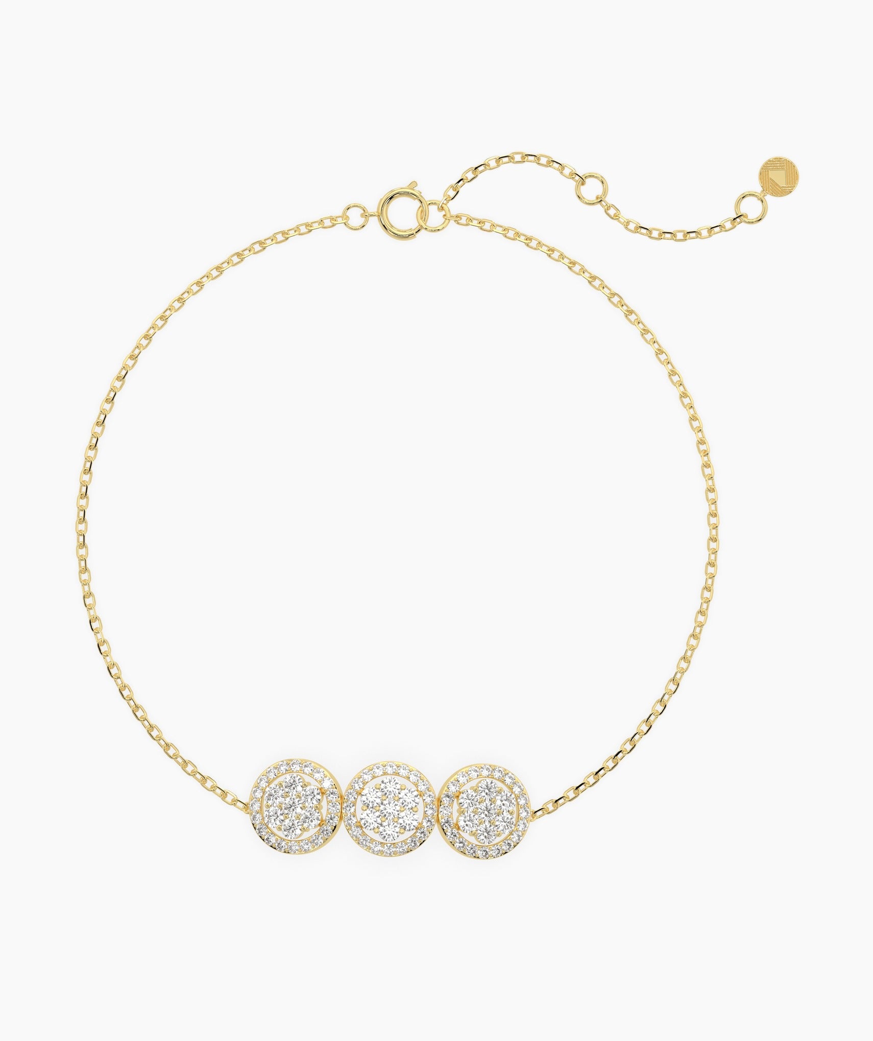 Crafted from 14K solid gold, this exquisite bracelet features three beautifully designed discs, each adorned with a halo of sparkling diamonds.