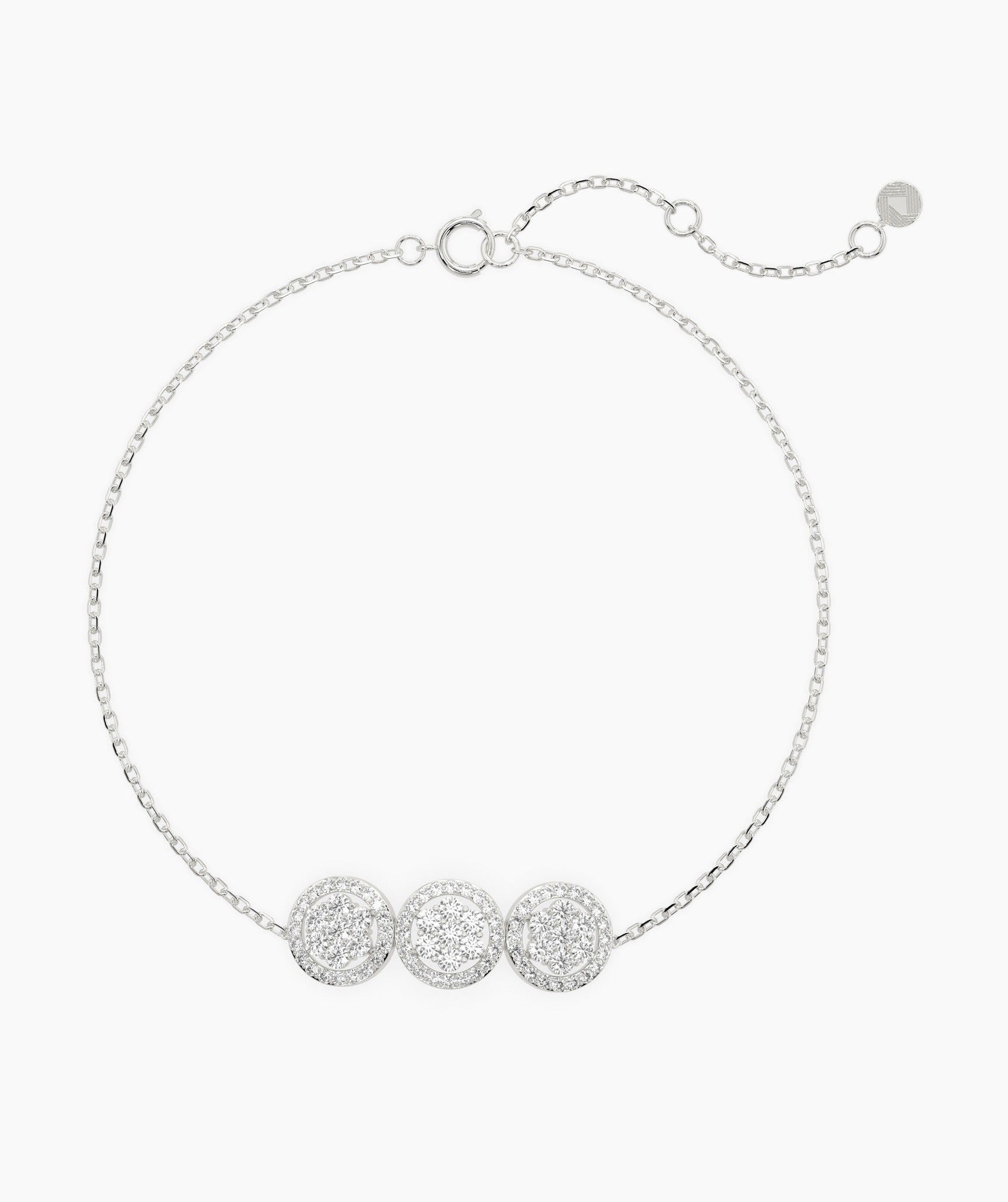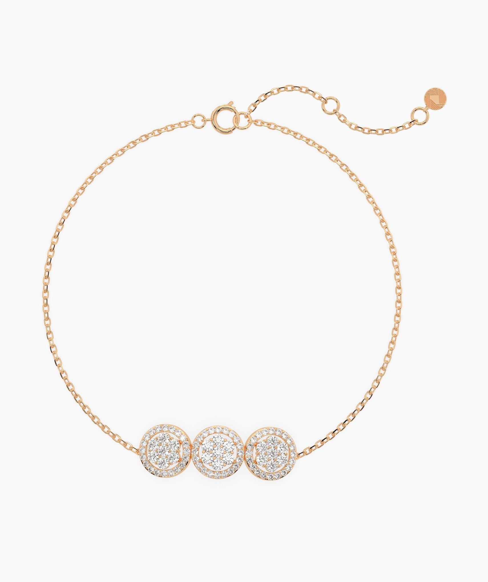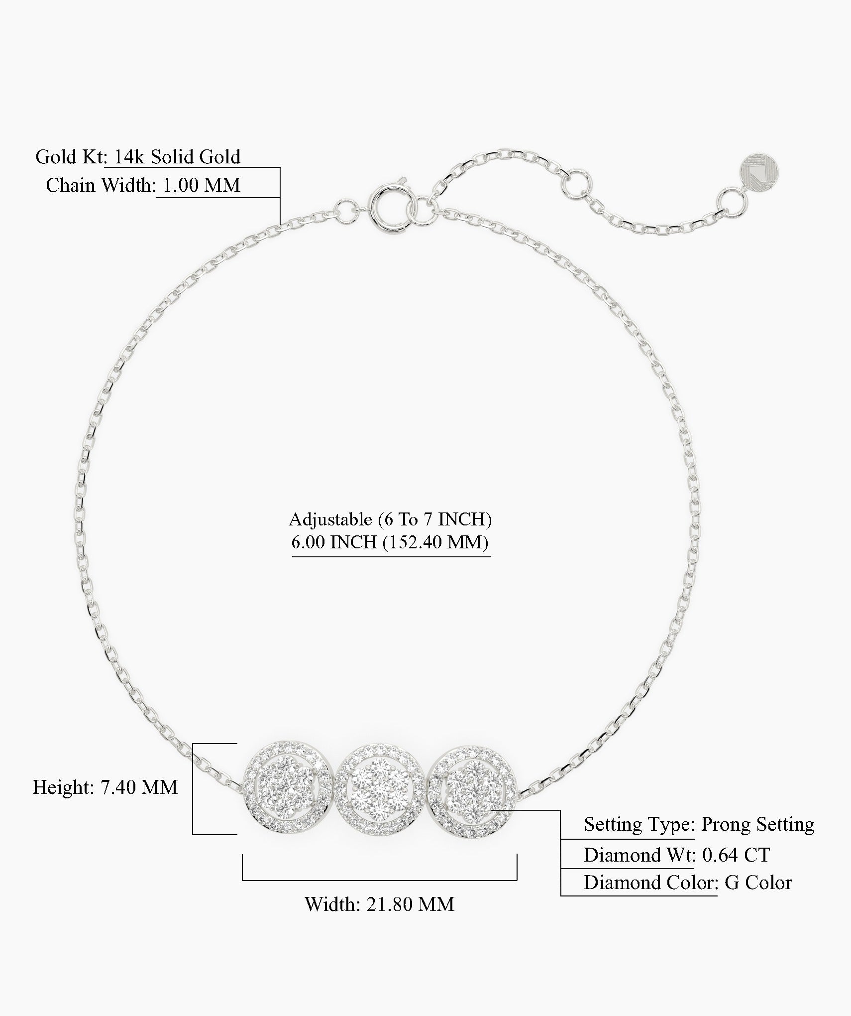 Crafted from 14K solid gold, this exquisite bracelet features three beautifully designed discs, each adorned with a halo of sparkling diamonds.